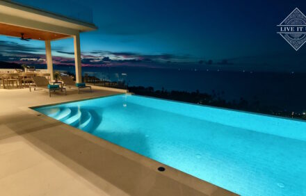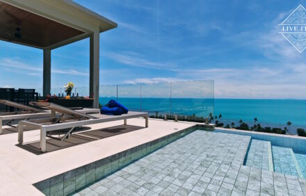 Designed in the evocative Moon Shadow styling to the premium quality build and finishing with superior standards of luxury and comfort to provide luxury living at its best. The top floor features open-plan living with captivating floor-to-ceiling windows, inviting abundant natural light and warmth. Kitchen and dining space, with the master bedroom leading directly onto the pool deck and terrace with stunning sea views. The second and third bedrooms are downstairs, both with an en-suite bathroom. The fantastic sea view swimming pool is equipped with a counter jet system. On the top terrace, you can find sun beds overlooking the sea and Koh Phangan island.