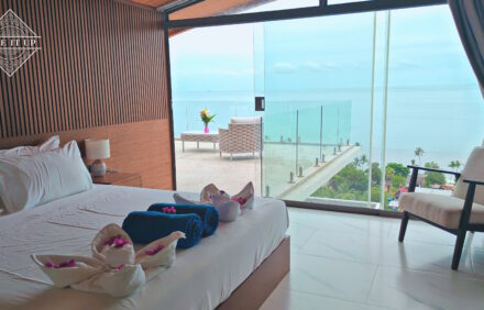 Santi Pura Villas are nestled within the idyllic surroundings of a prestigious hillside location, offering masterful views out over the Gulf of Thailand and across to the neighbouring island of Koh Phangan to the north and Angthong National Marine Park to the west. The project is situated in the serene setting of Bang Por Beach, at the top of a gentle slope, just 200 meters from the sea. Bang Por Beach is on the northwestern coast of Koh Samui.