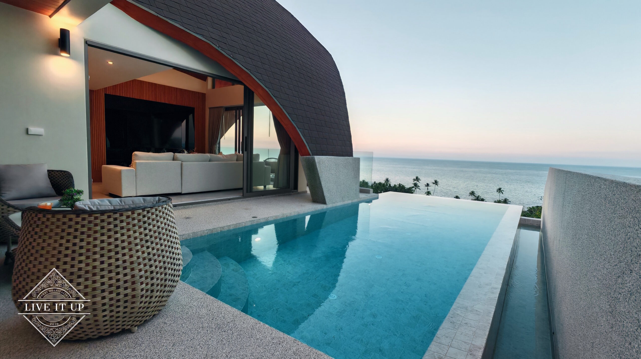 Designed in the elegant Moon Shadow style, the villa offers premium quality and exceptional comfort throughout. The top floor features an open-plan living area with floor-to-ceiling windows that fill the space with natural light. A modern kitchen and dining area create a warm, inviting atmosphere, while the master bedroom opens directly onto the pool deck and terrace, where stunning sea views await. The lower level hosts two additional bedrooms, each with its own en-suite bathroom, ensuring privacy and comfort for families or groups. Outside, the sea-view swimming pool includes a counter-jet system for an elevated swimming experience, and the rooftop terrace features sunbeds overlooking the ocean and the island of Koh Phangan.