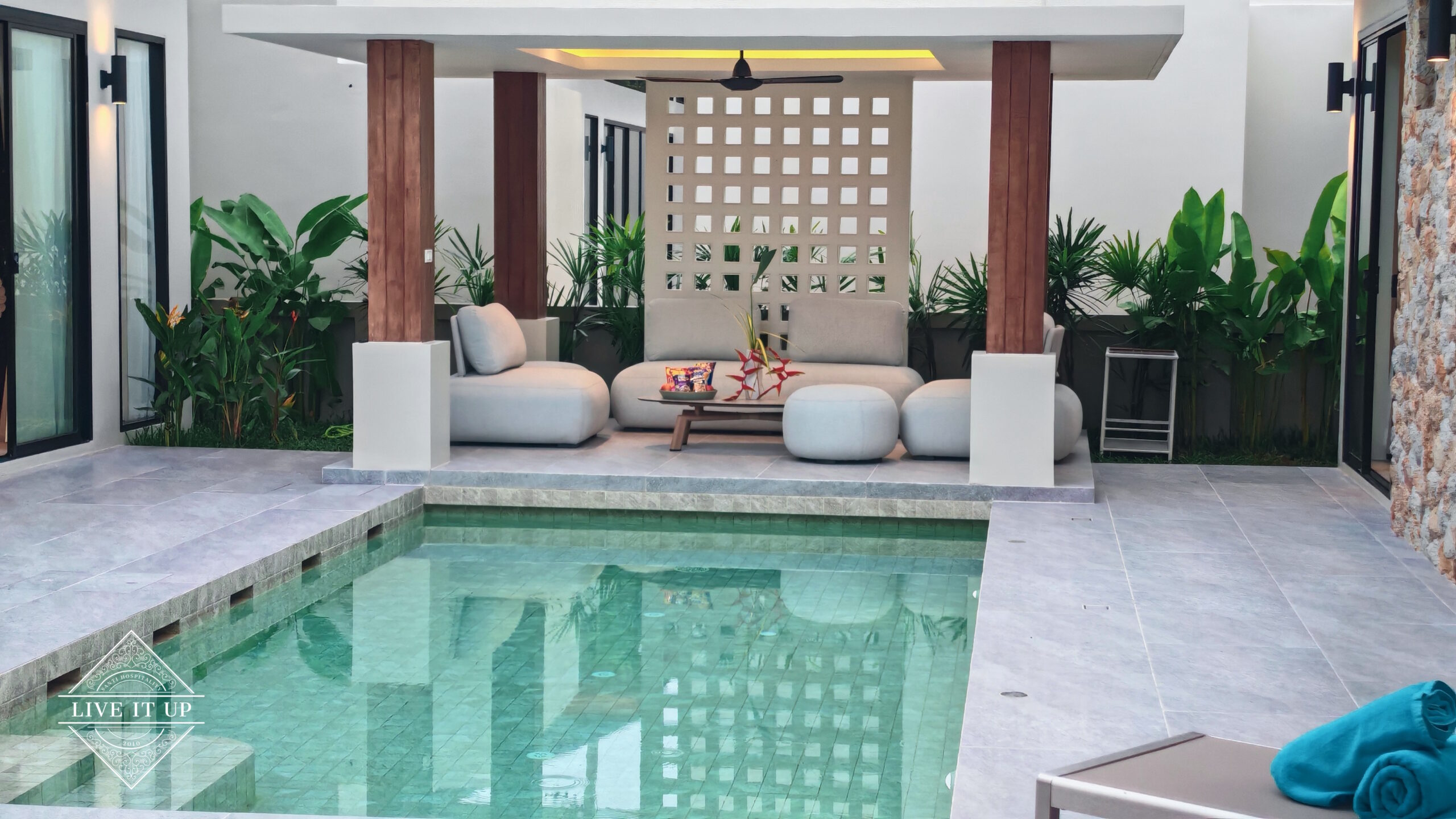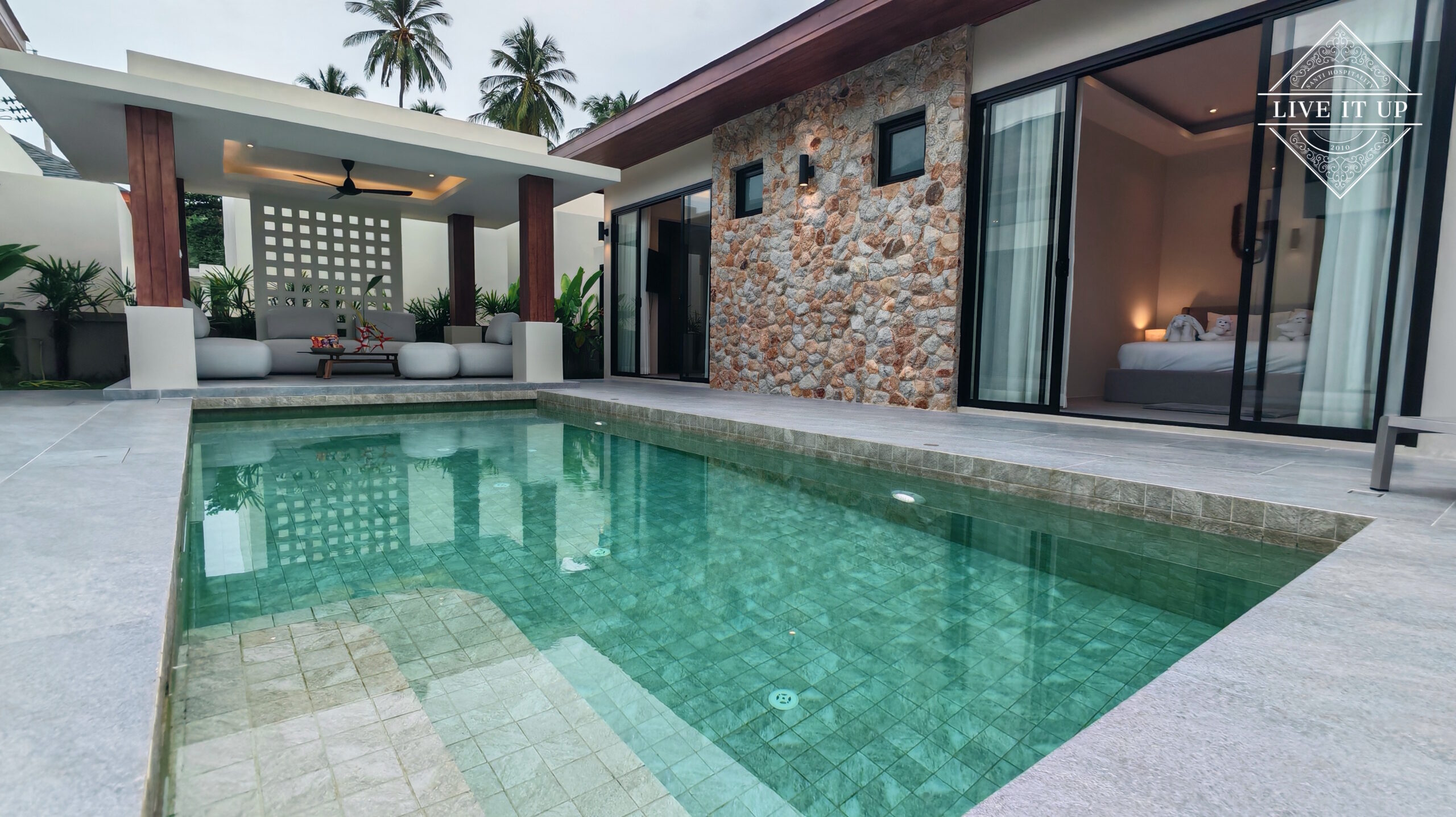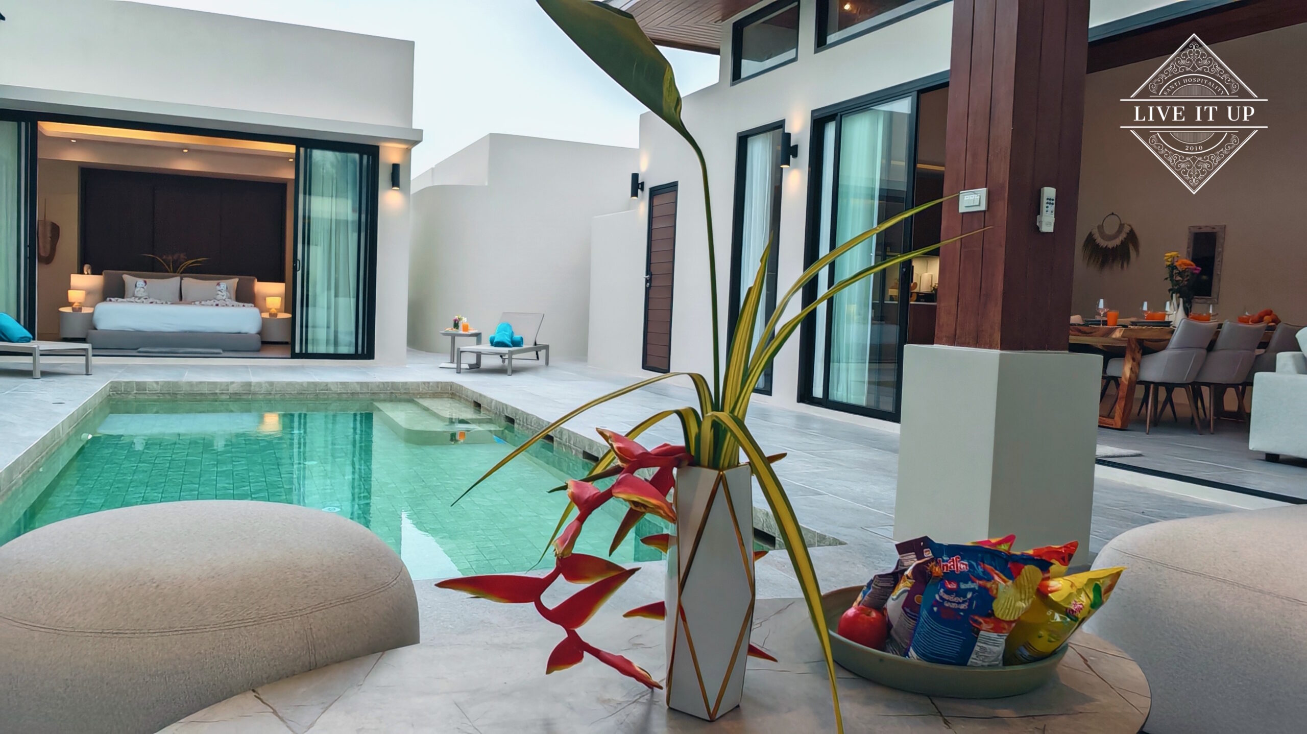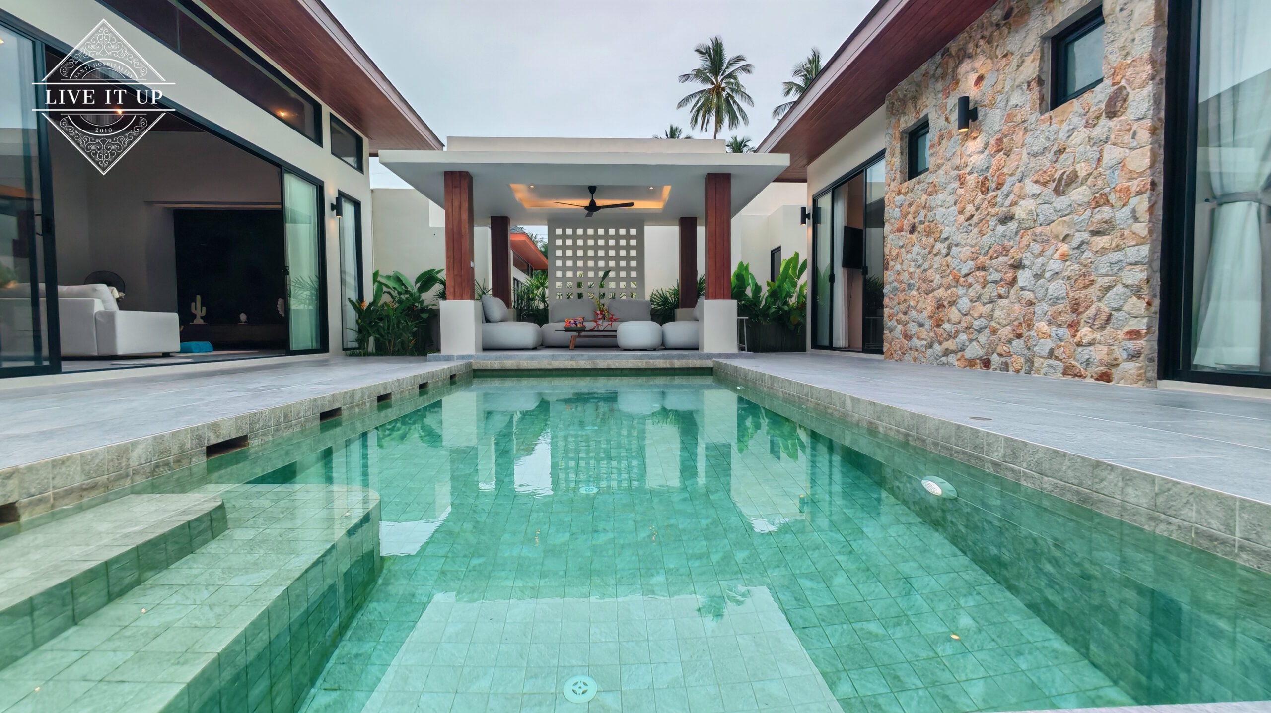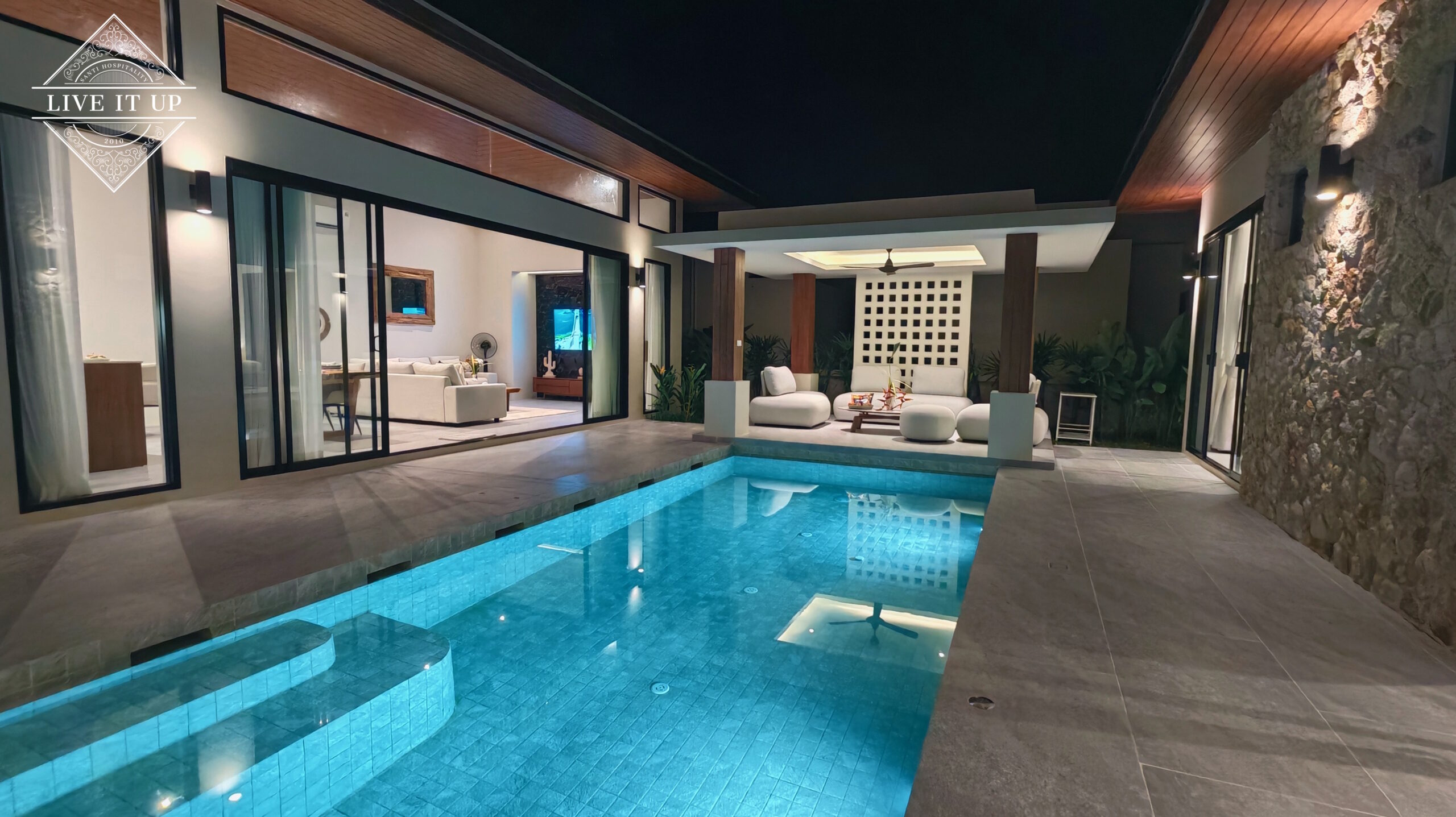 The villa is spread over a series of stunning single-storey pavilions. The leading pavilion houses a spacious open-plan living and dining area, a comfortable lounge and a Western-style fully equipped kitchen with a breakfast island, serving a 6-seater dining table. A guest wash closet and a hidden laundry area are also at the property’s backside. The main bedroom features a large en-suite bathroom and a bathtub. A relaxing outdoor covered Sala seating area sits at the poolside. The centrepiece of the outdoor space is a huge private swimming pool with lush landscaping and natural rock features incorporated into the design. All bedrooms are equipped with smart TVs, huge wardrobes and en suite bathrooms.