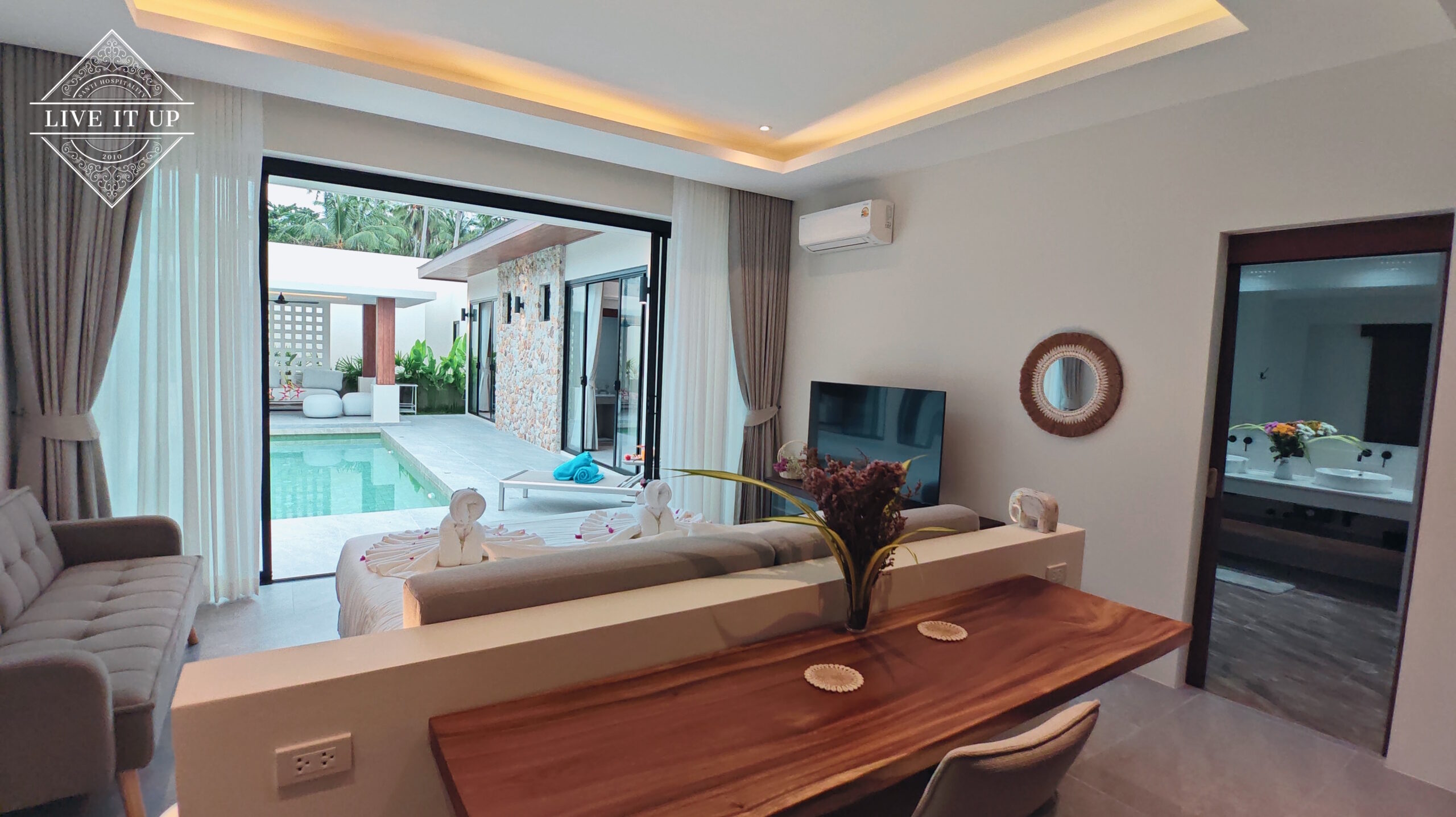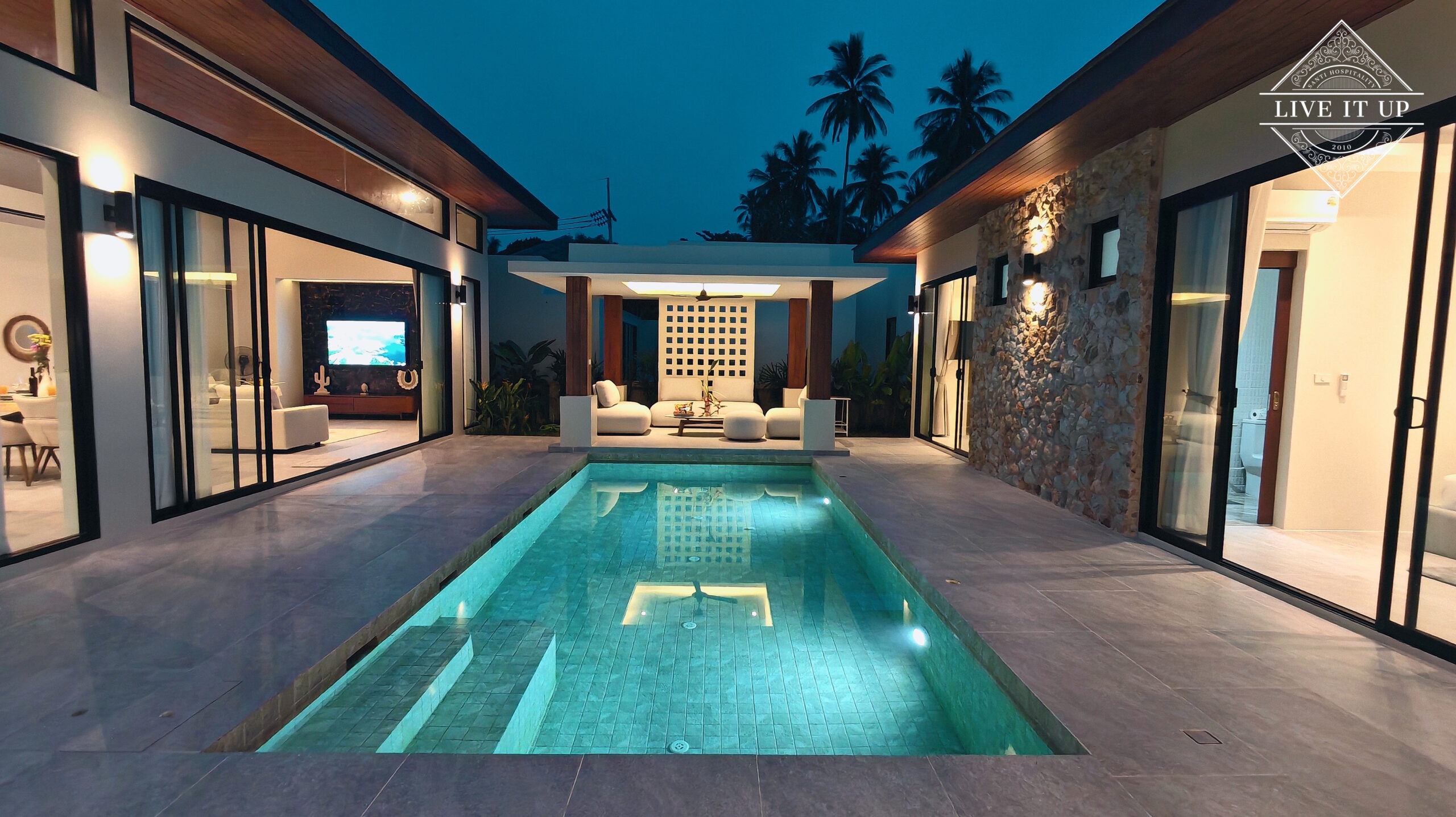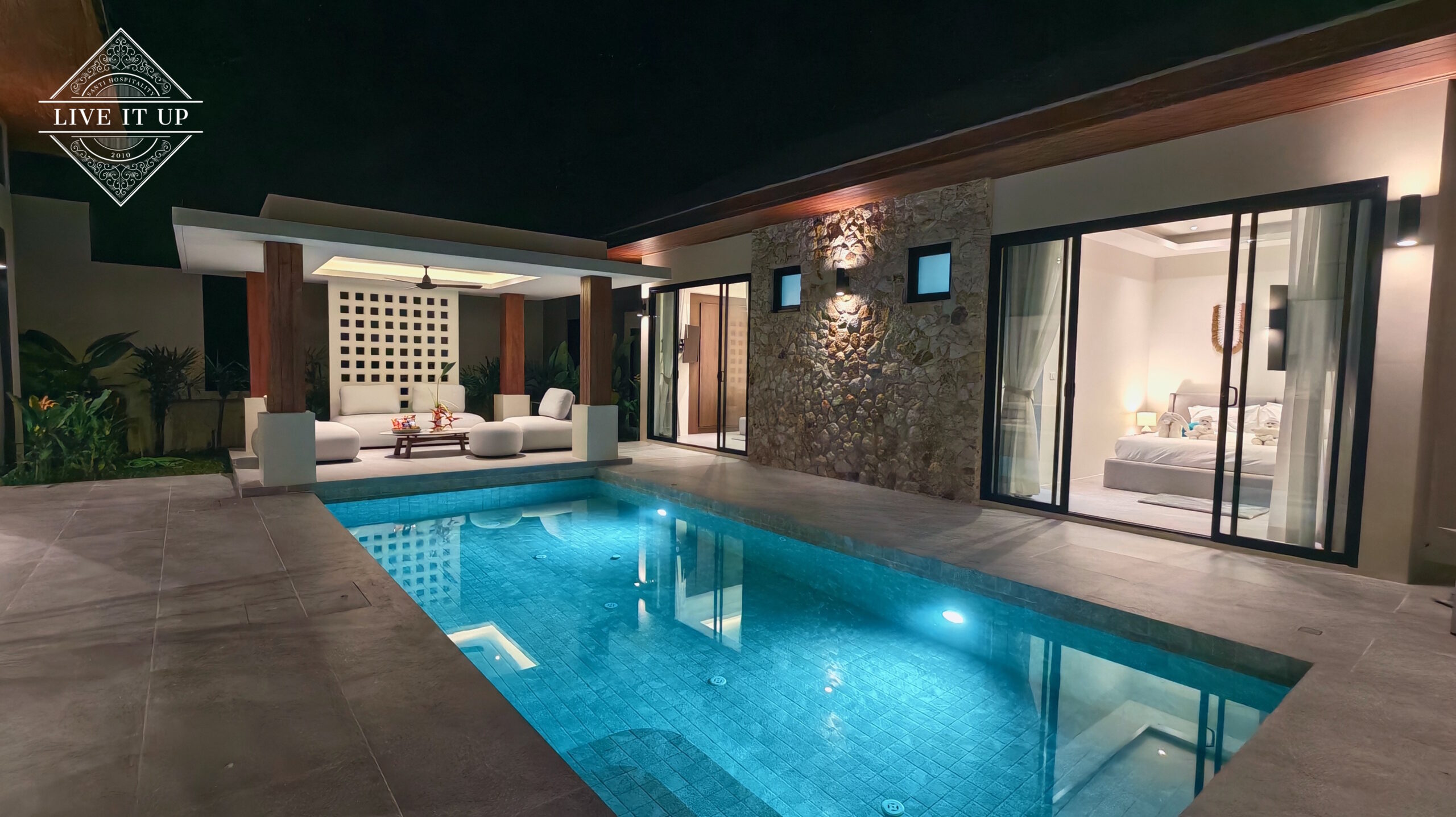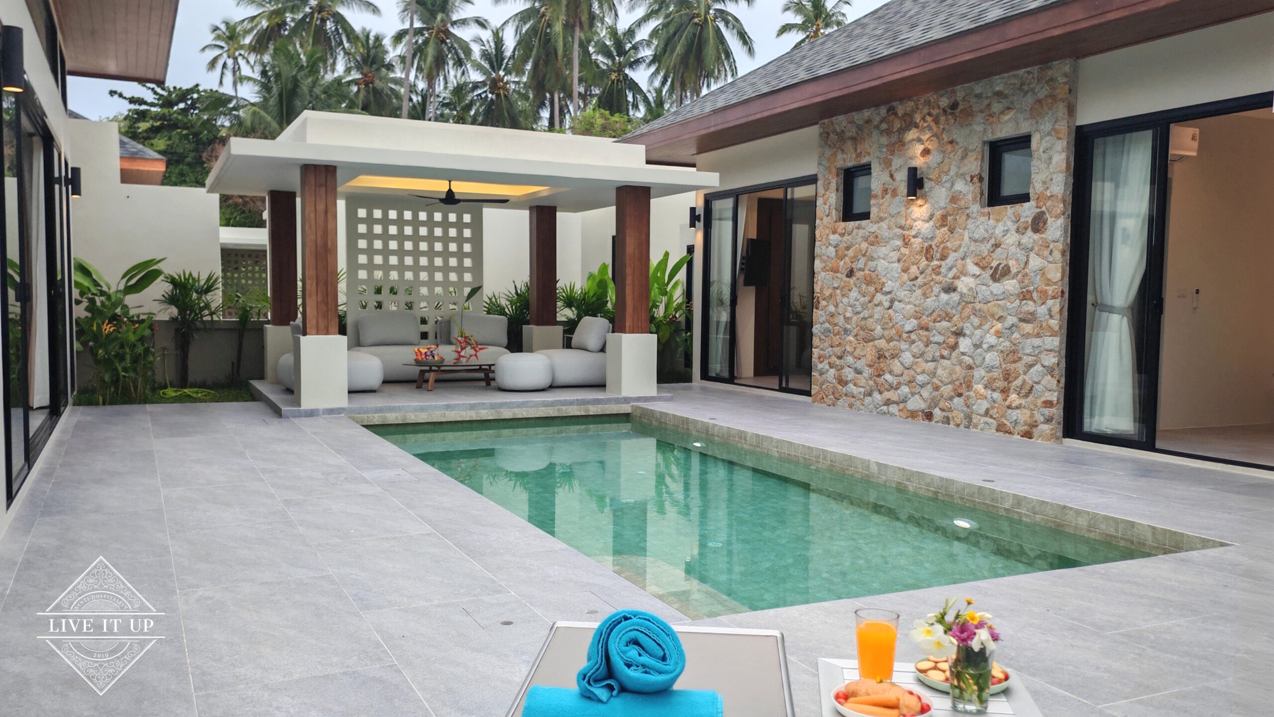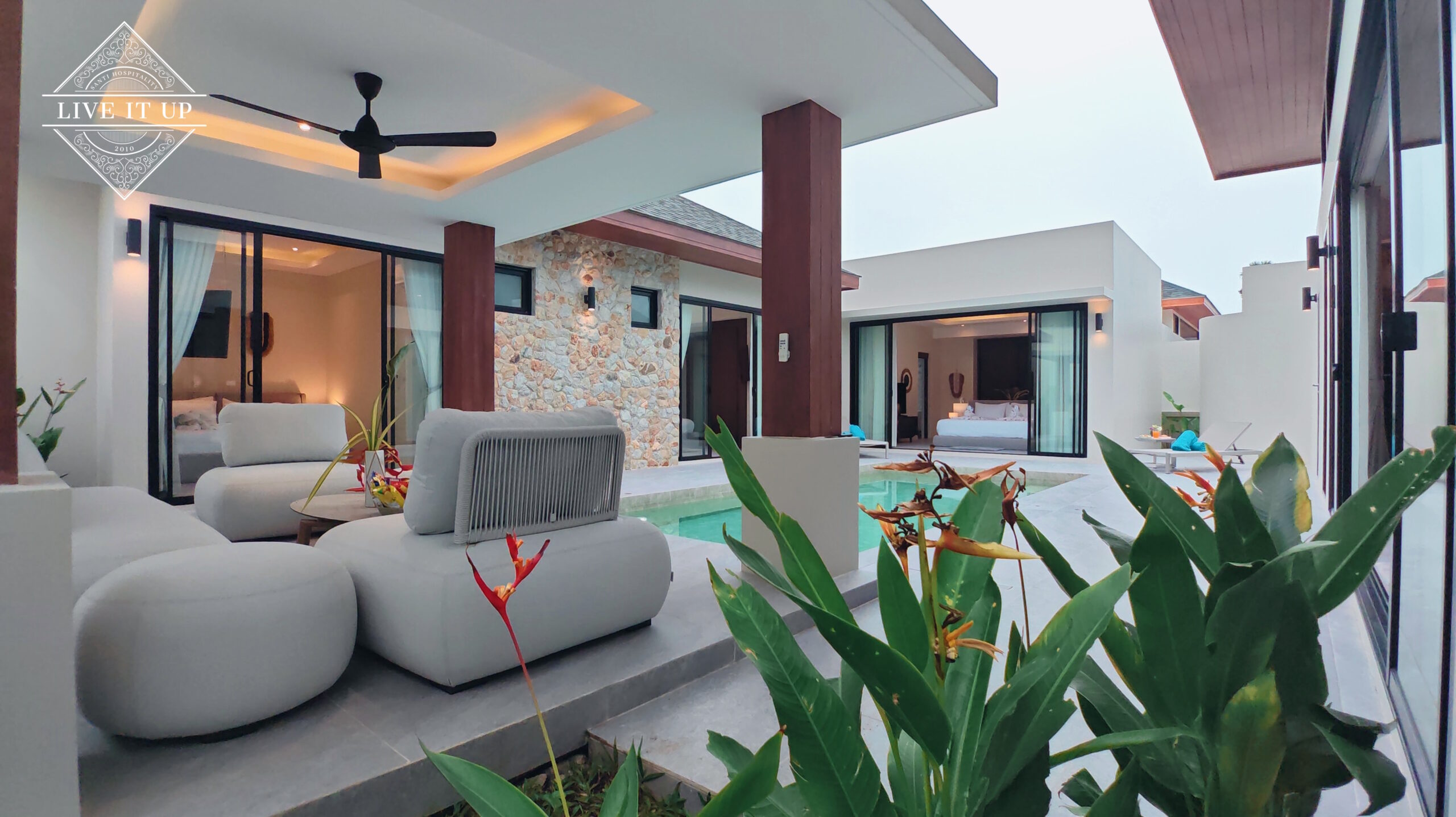 The villa is spread over a series of stunning single-storey pavilions. The leading pavilion houses a spacious open-plan living and dining area, a comfortable lounge and a Western-style fully equipped kitchen with a breakfast island, serving a 6-seater dining table. A guest wash closet and a hidden laundry area are also at the property’s backside. The main bedroom features a large en-suite bathroom and a bathtub. A relaxing outdoor covered Sala seating area sits at the poolside. The centrepiece of the outdoor space is a huge private swimming pool with lush landscaping and natural rock features incorporated into the design. All bedrooms are equipped with smart TVs, huge wardrobes and en suite bathrooms.