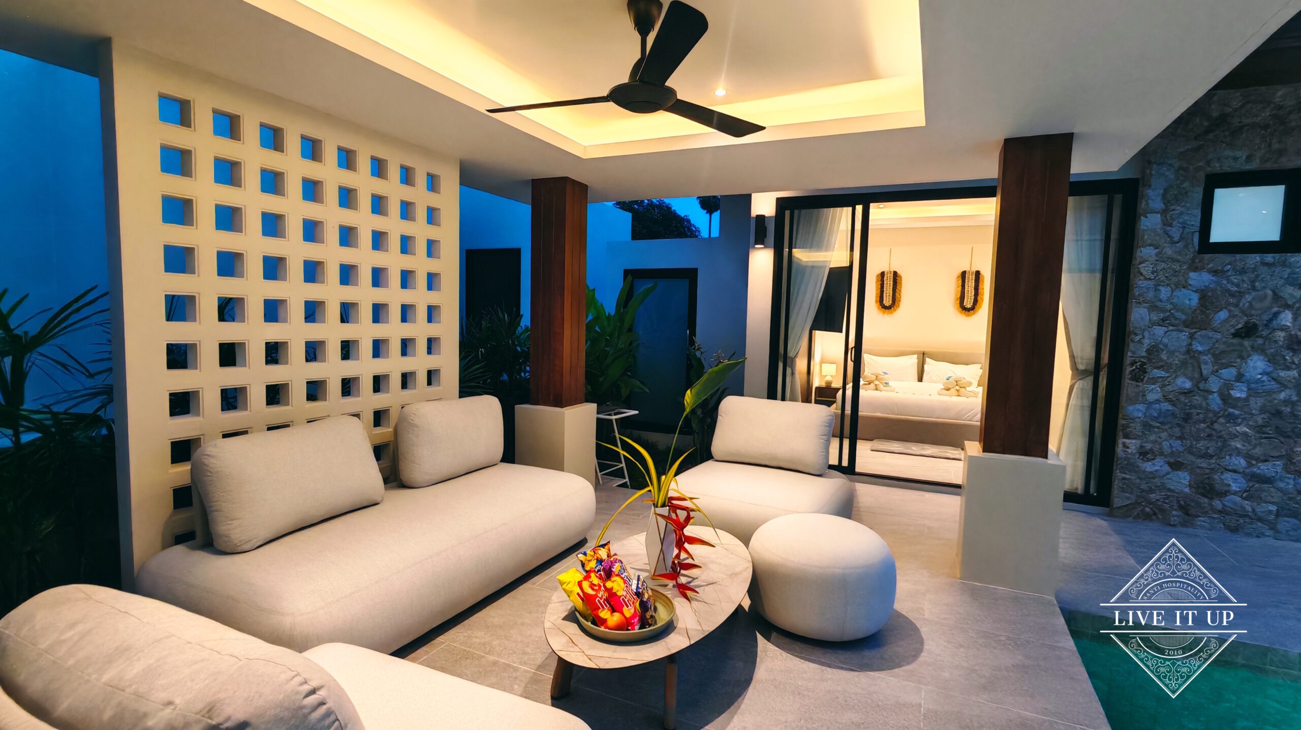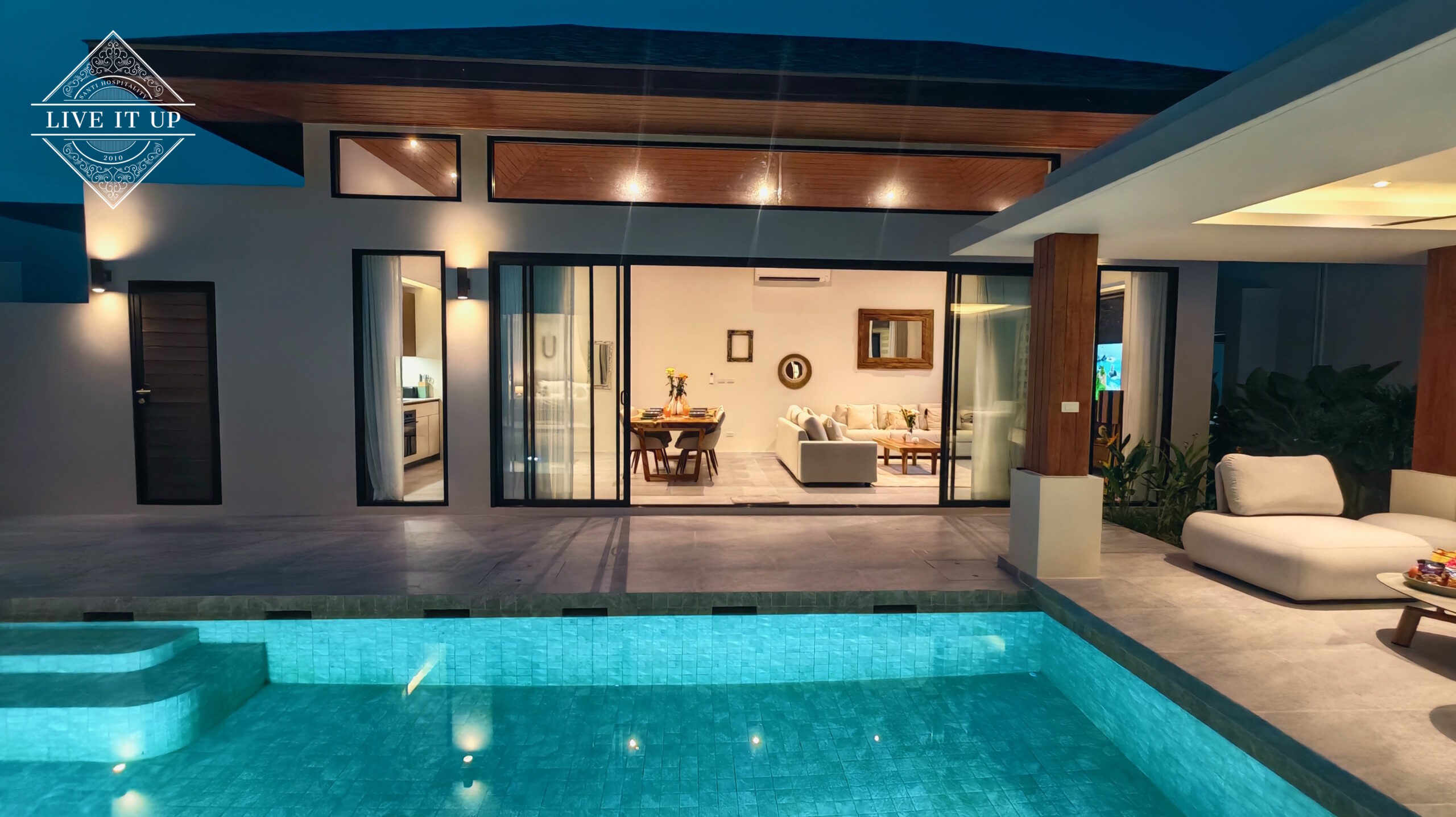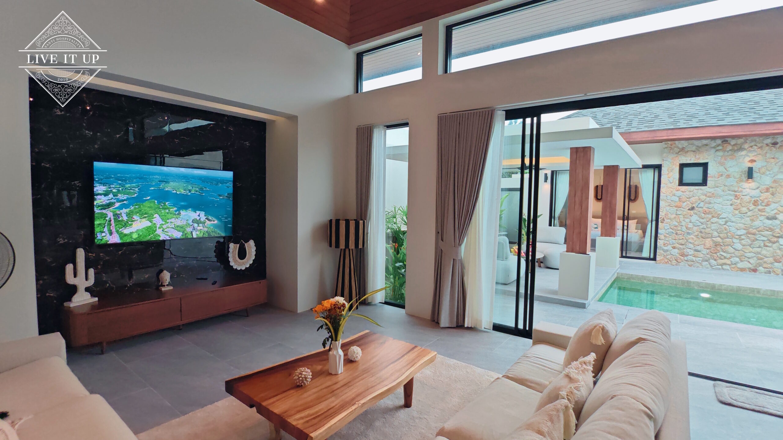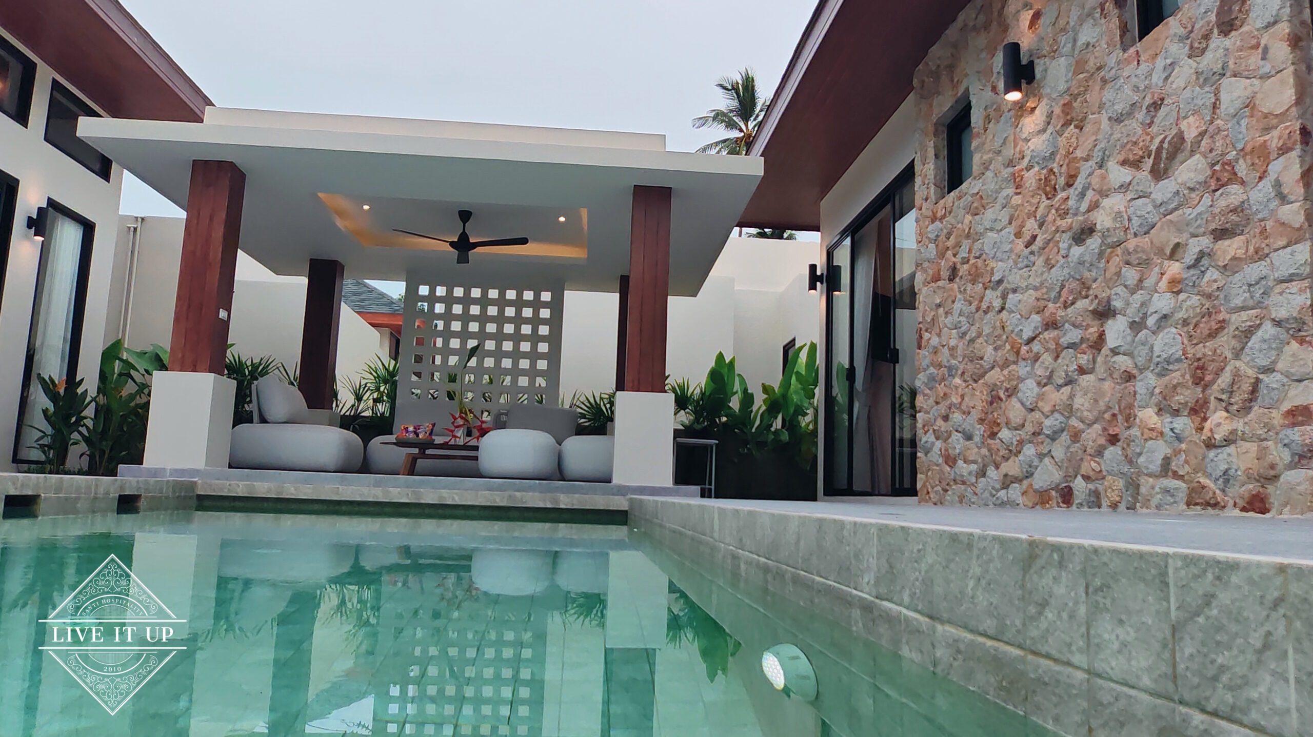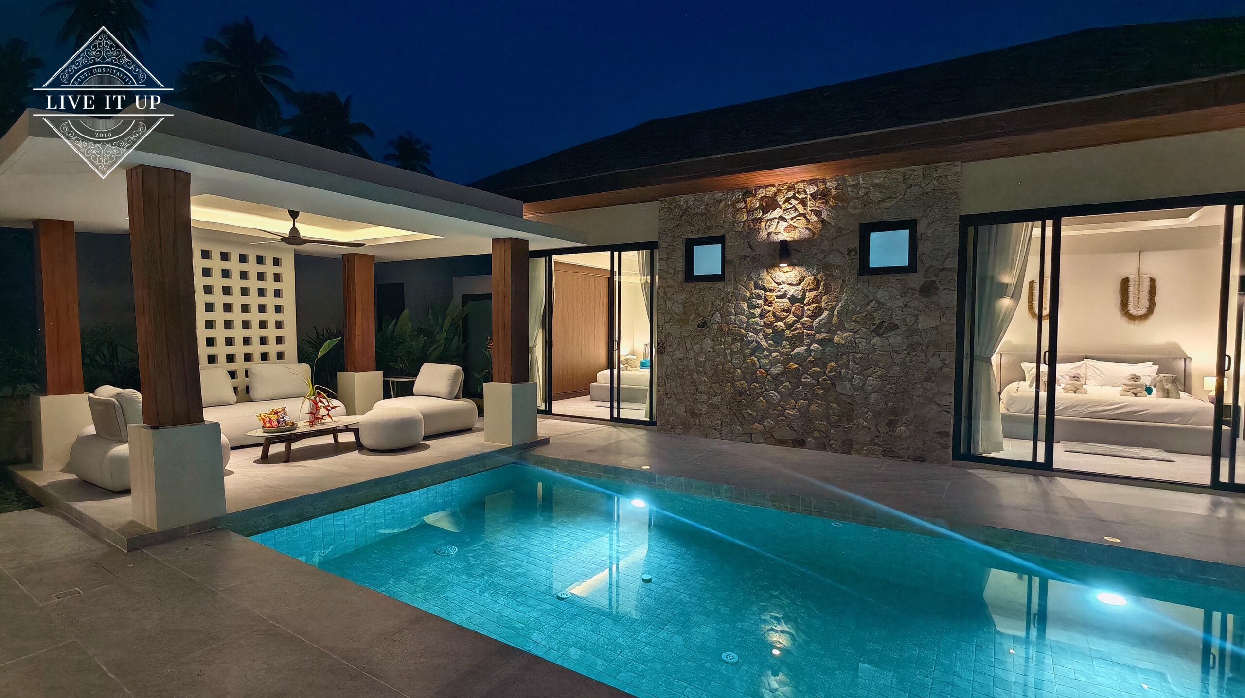 The villa is spread over a series of stunning single-storey pavilions. The leading pavilion houses a spacious open-plan living and dining area, a comfortable lounge and a Western-style fully equipped kitchen with a breakfast island, serving a 6-seater dining table. A guest wash closet and a hidden laundry area are also at the property’s backside. The main bedroom features a large en-suite bathroom and a bathtub. A relaxing outdoor covered Sala seating area sits at the poolside. The centrepiece of the outdoor space is a huge private swimming pool with lush landscaping and natural rock features incorporated into the design. All bedrooms are equipped with smart TVs, huge wardrobes and en suite bathrooms.
