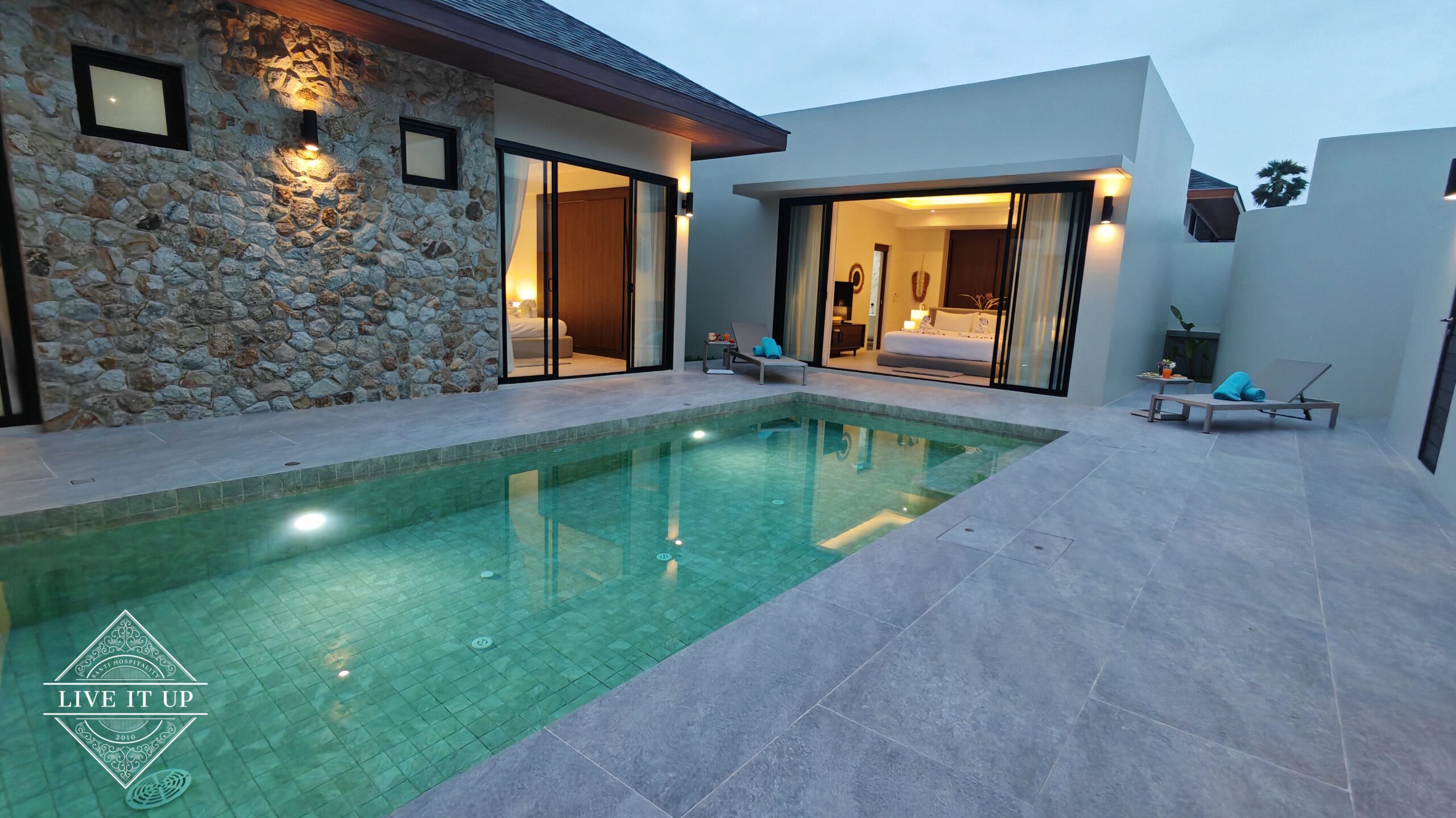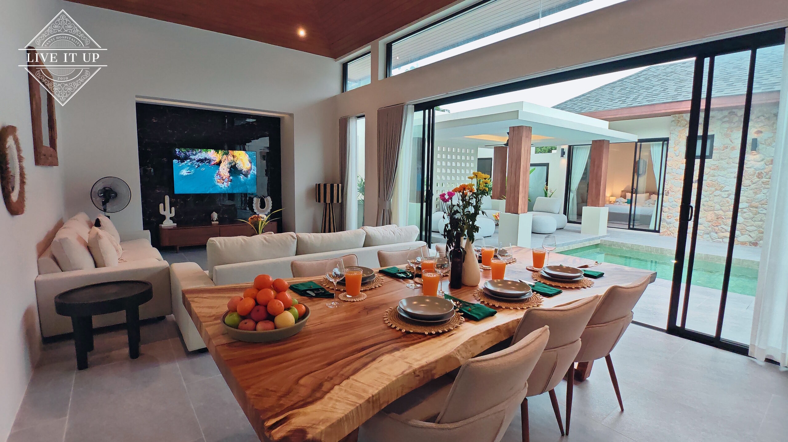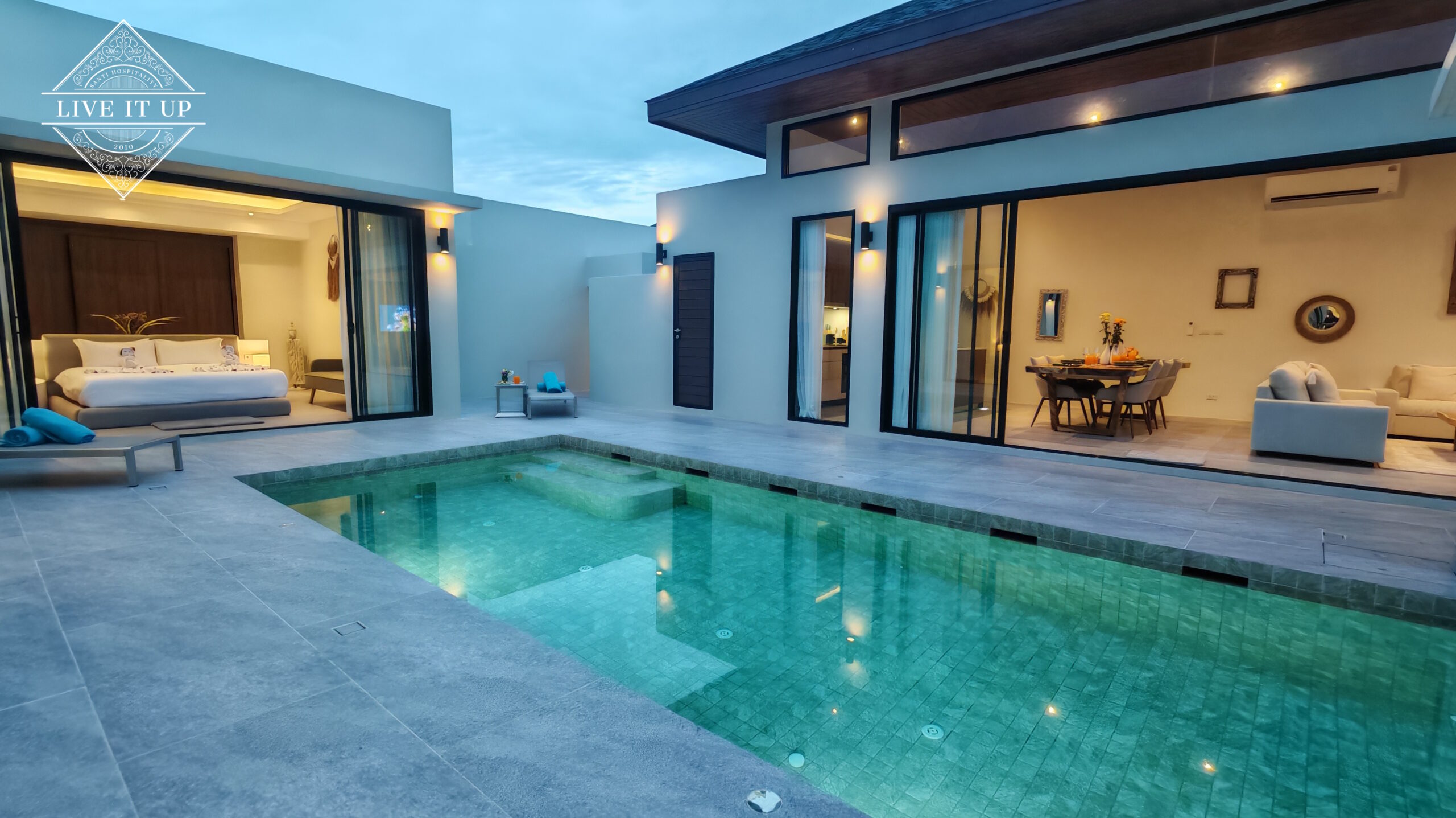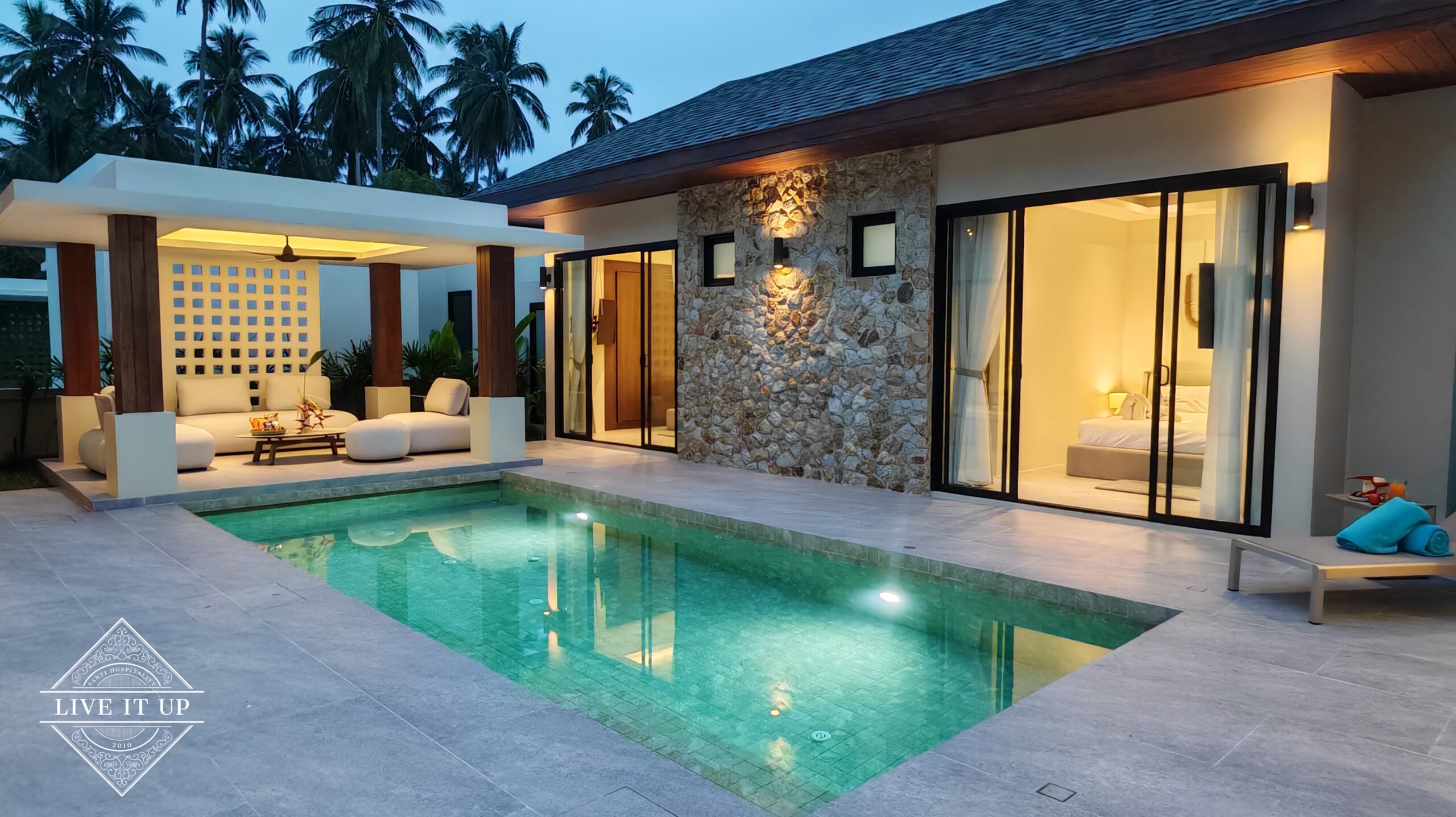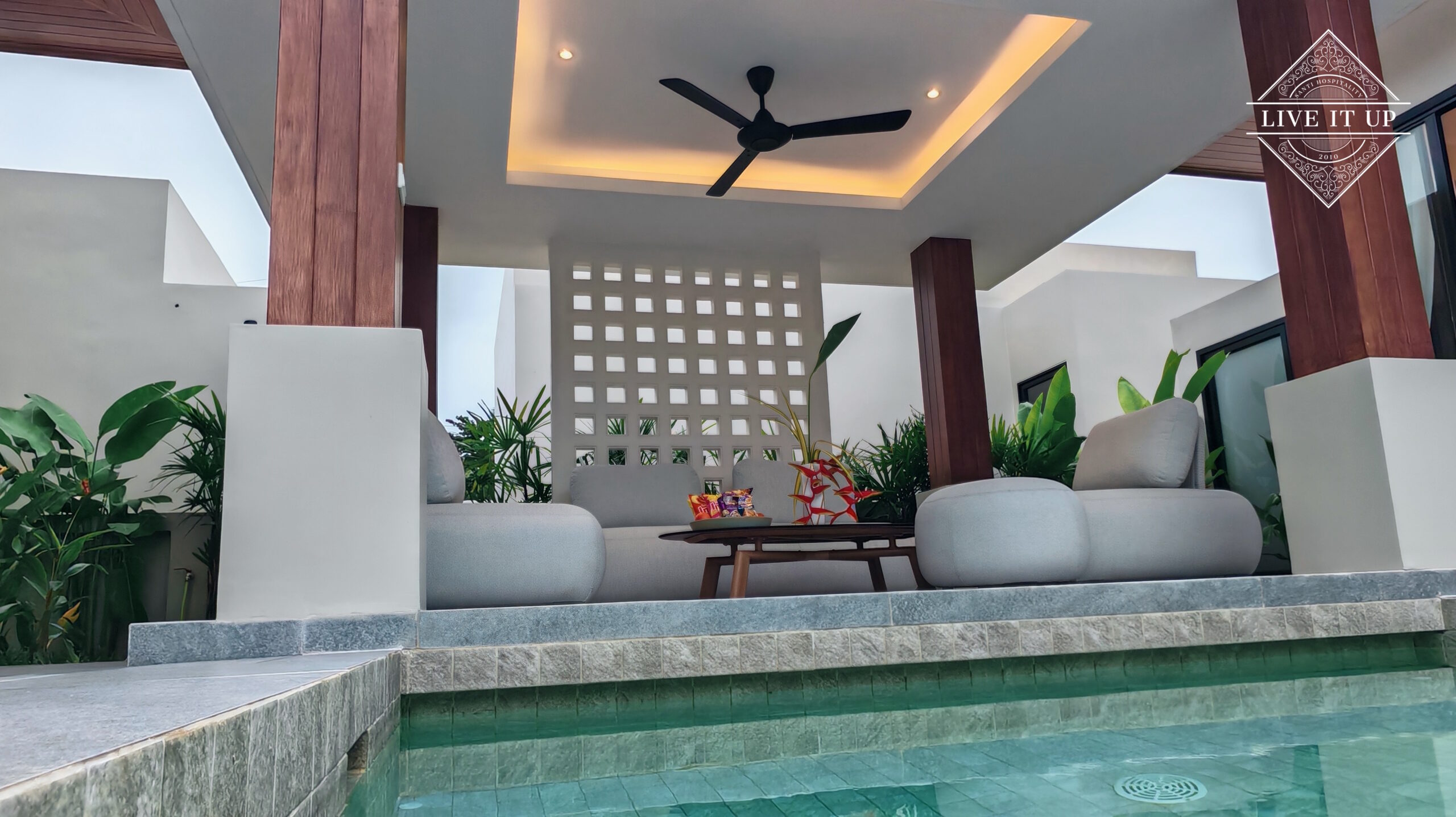 The villa is spread over a series of stunning single-storey pavilions. The leading pavilion houses a spacious open-plan living and dining area, a comfortable lounge and a Western-style fully equipped kitchen with a breakfast island, serving a 6-seater dining table. A guest wash closet and a hidden laundry area are also at the property’s backside. The main bedroom features a large en-suite bathroom and a bathtub. A relaxing outdoor covered Sala seating area sits at the poolside. The centrepiece of the outdoor space is a huge private swimming pool with lush landscaping and natural rock features incorporated into the design. All bedrooms are equipped with smart TVs, huge wardrobes and en suite bathrooms.