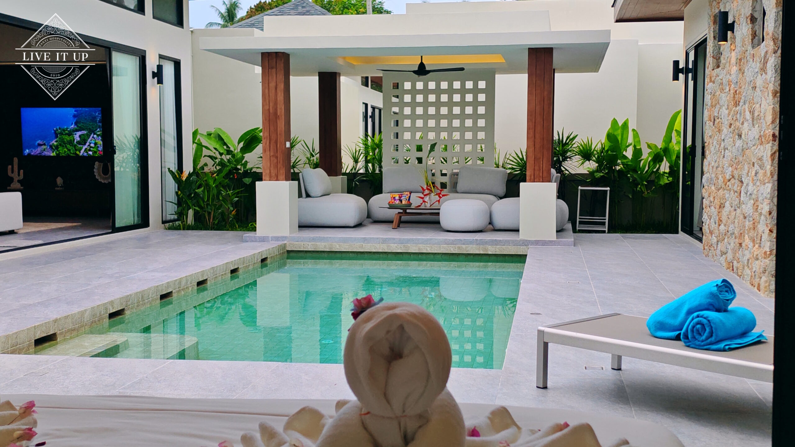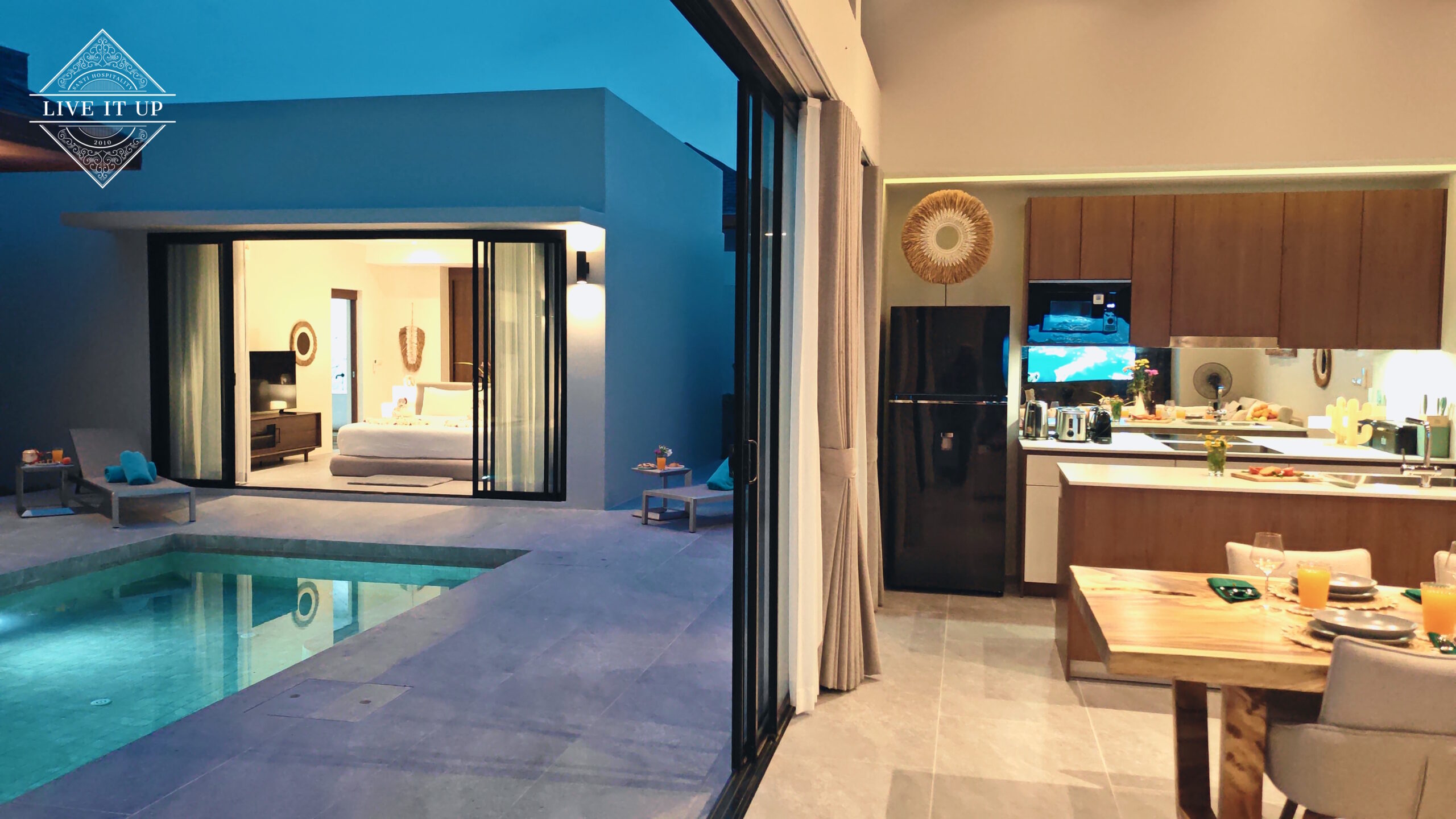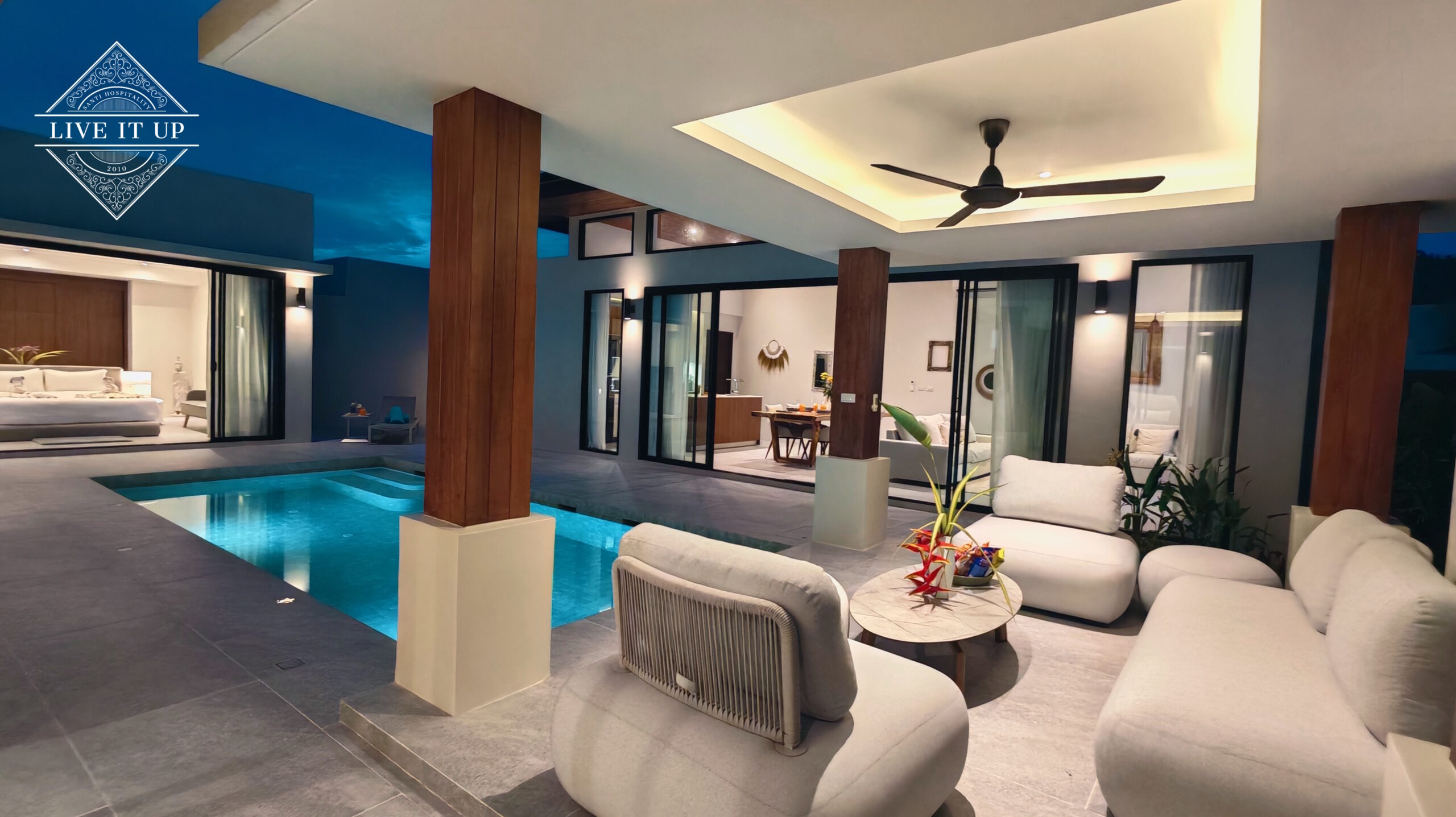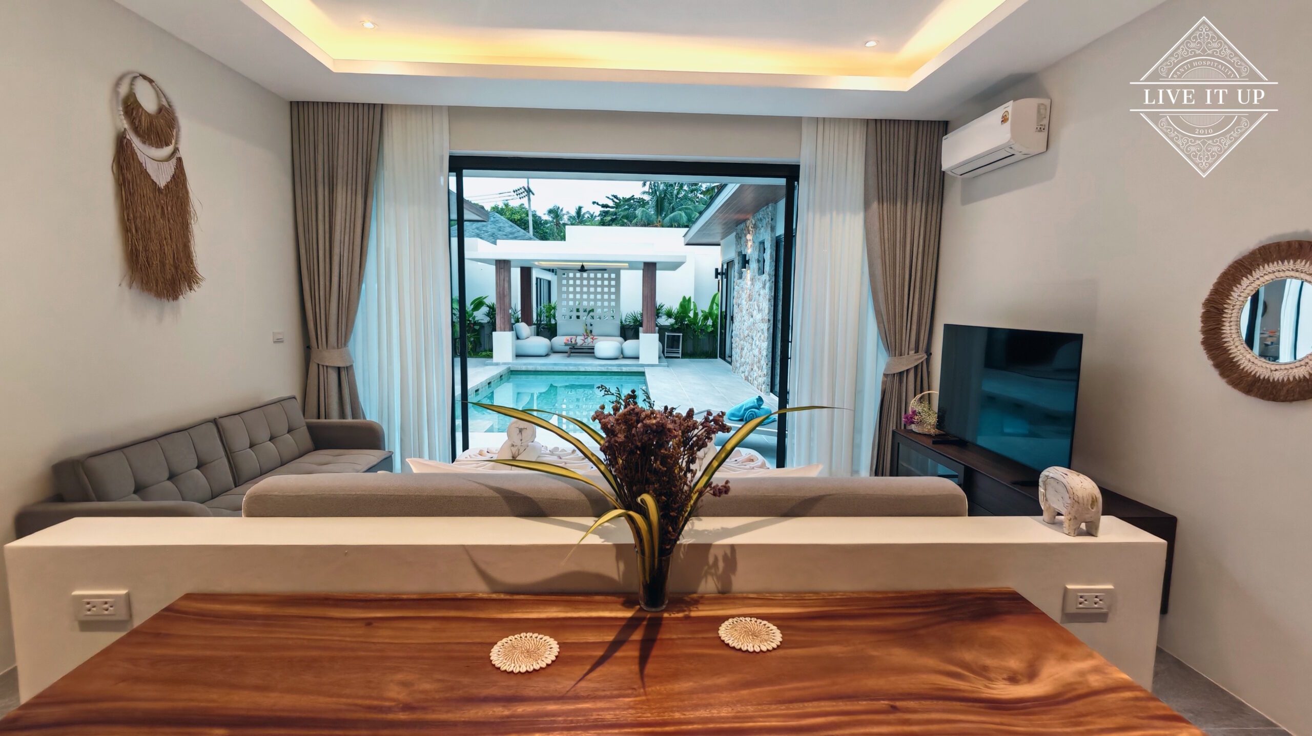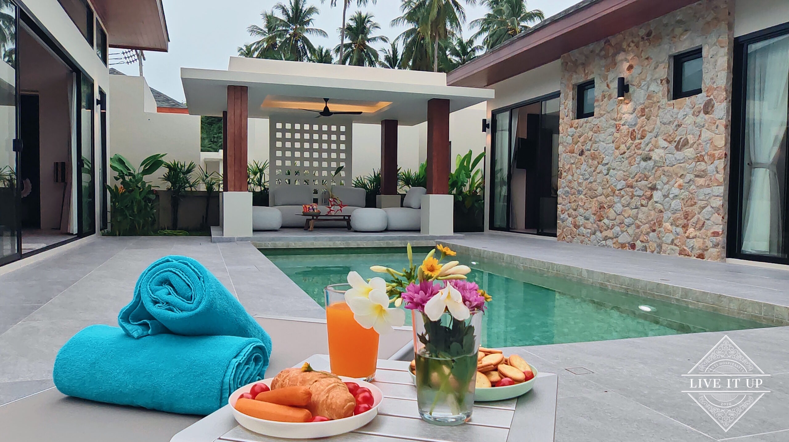 The villa is spread over a series of stunning single-storey pavilions. The leading pavilion houses a spacious open-plan living and dining area, a comfortable lounge and a Western-style fully equipped kitchen with a breakfast island, serving a 6-seater dining table. A guest wash closet and a hidden laundry area are also at the property’s backside. The main bedroom features a large en-suite bathroom and a bathtub. A relaxing outdoor covered Sala seating area sits at the poolside. The centrepiece of the outdoor space is a huge private swimming pool with lush landscaping and natural rock features incorporated into the design. All bedrooms are equipped with smart TVs, huge wardrobes and en suite bathrooms.