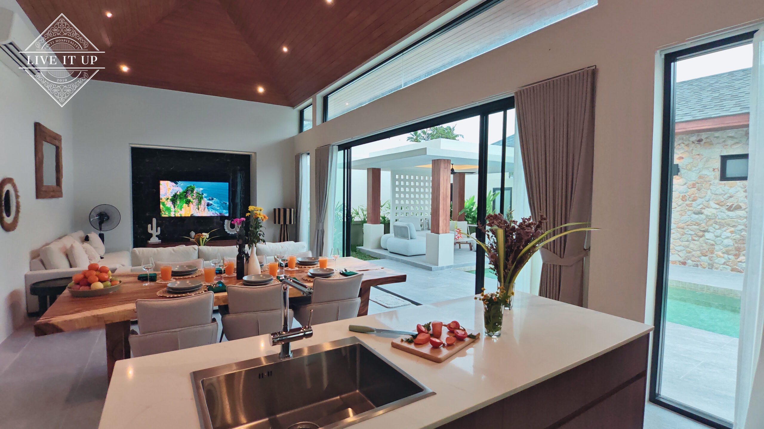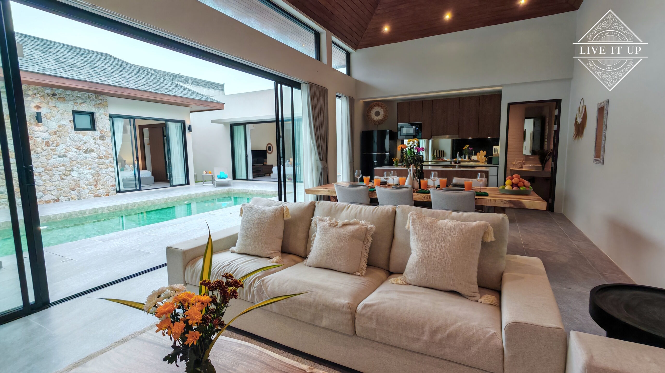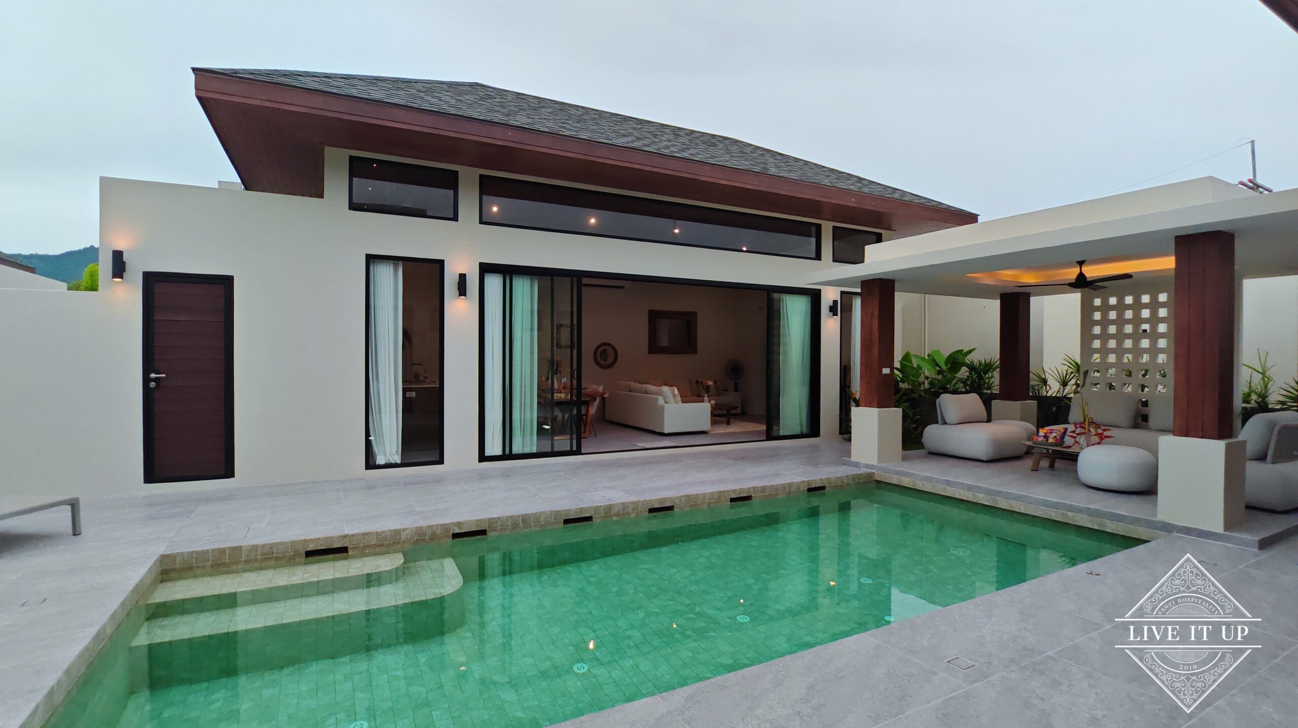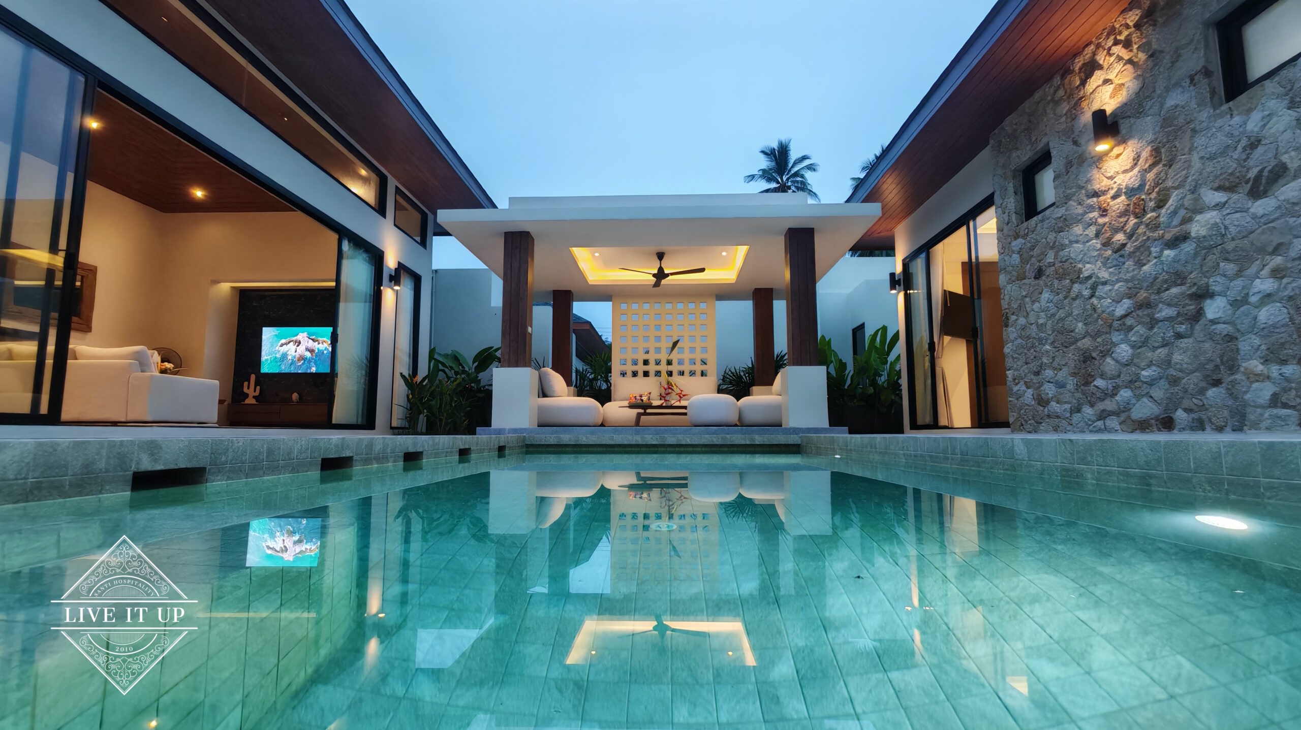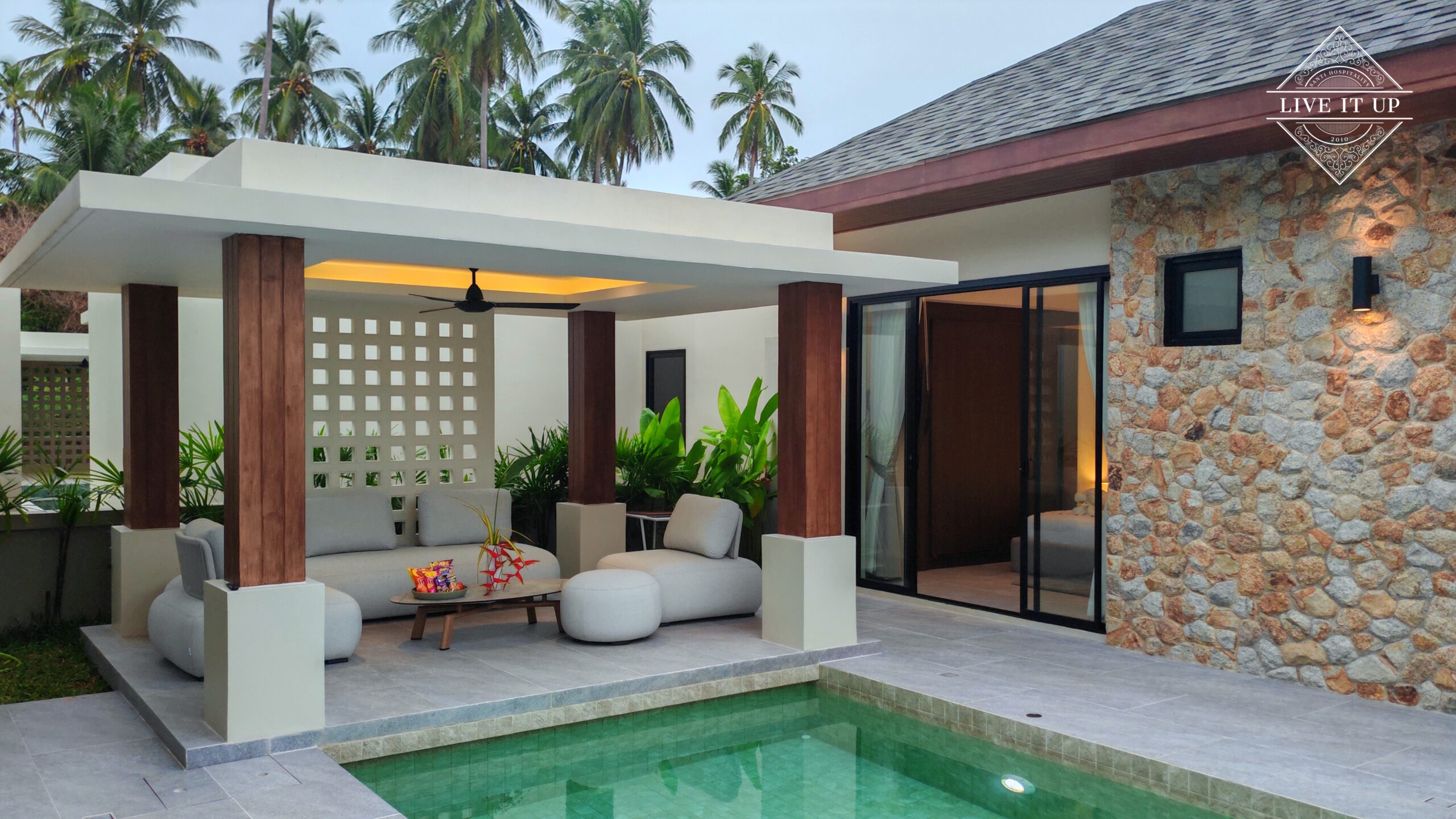 The villa is spread over a series of stunning single-storey pavilions. The leading pavilion houses a spacious open-plan living and dining area, a comfortable lounge and a Western-style fully equipped kitchen with a breakfast island, serving a 6-seater dining table. A guest wash closet and a hidden laundry area are also at the property’s backside. The main bedroom features a large en-suite bathroom and a bathtub. A relaxing outdoor covered Sala seating area sits at the poolside. The centrepiece of the outdoor space is a huge private swimming pool with lush landscaping and natural rock features incorporated into the design. All bedrooms are equipped with smart TVs, huge wardrobes and en suite bathrooms.
