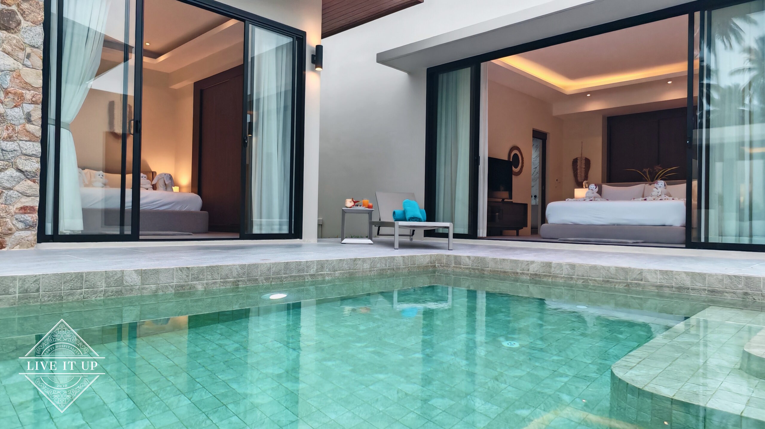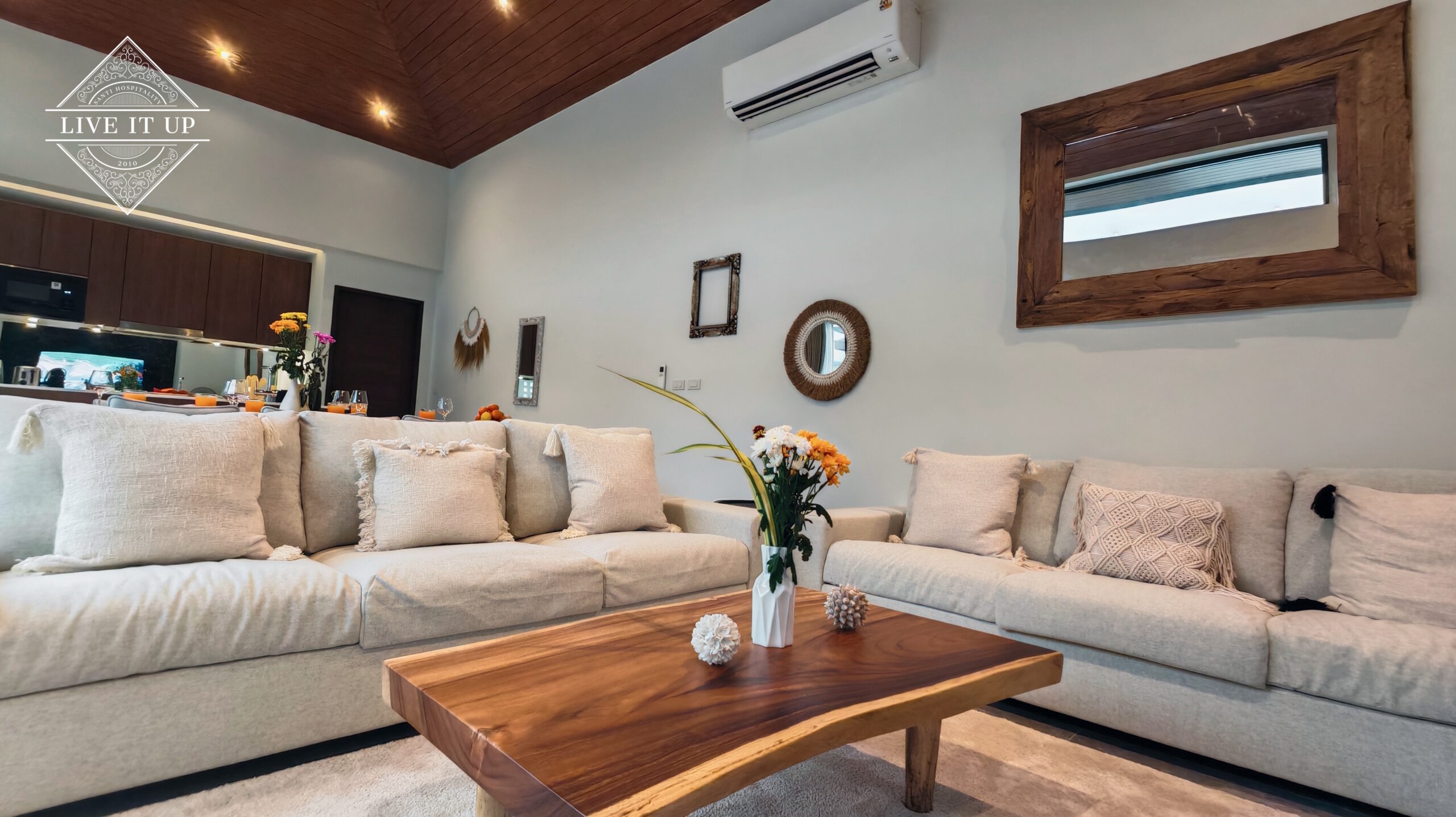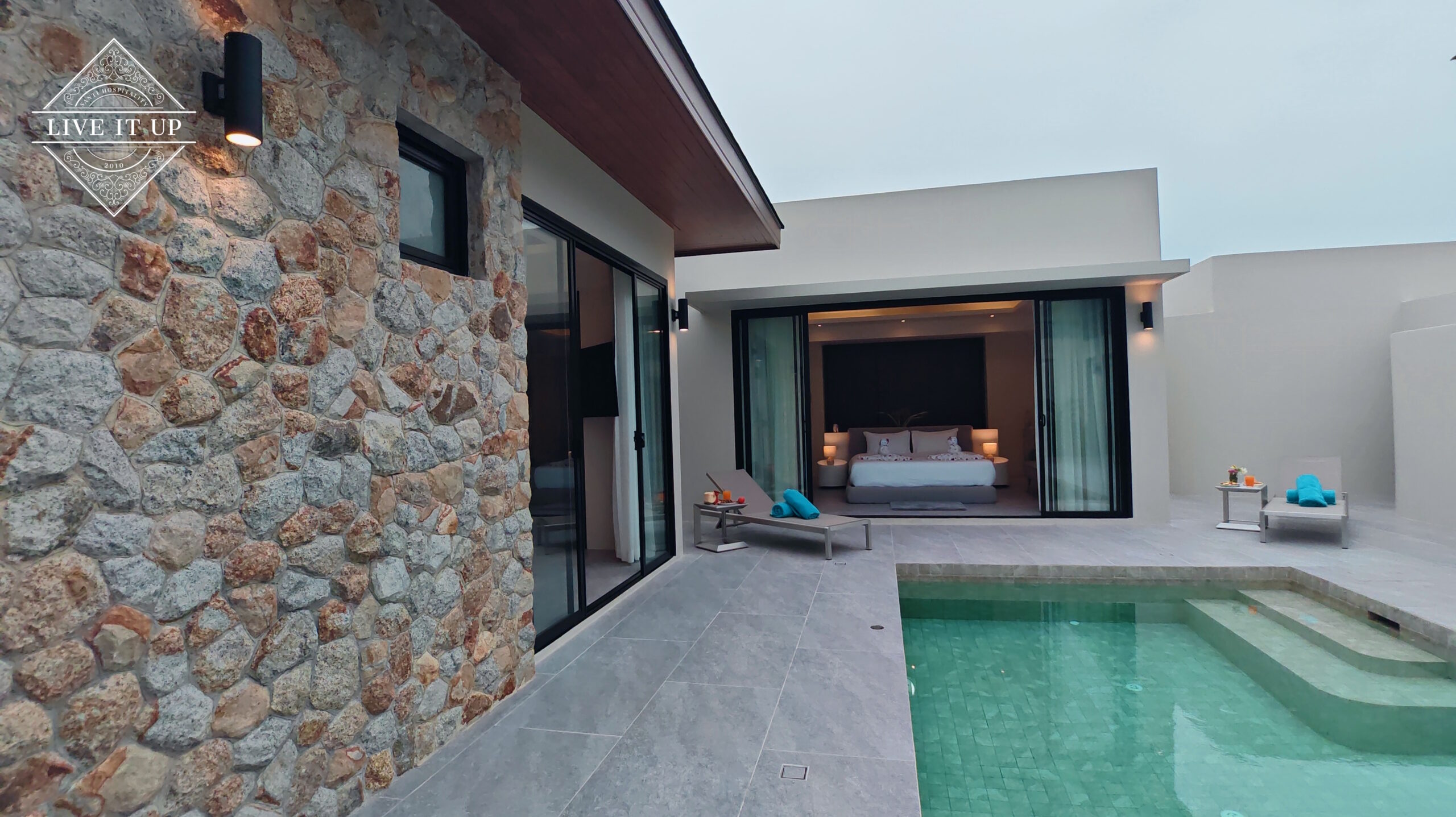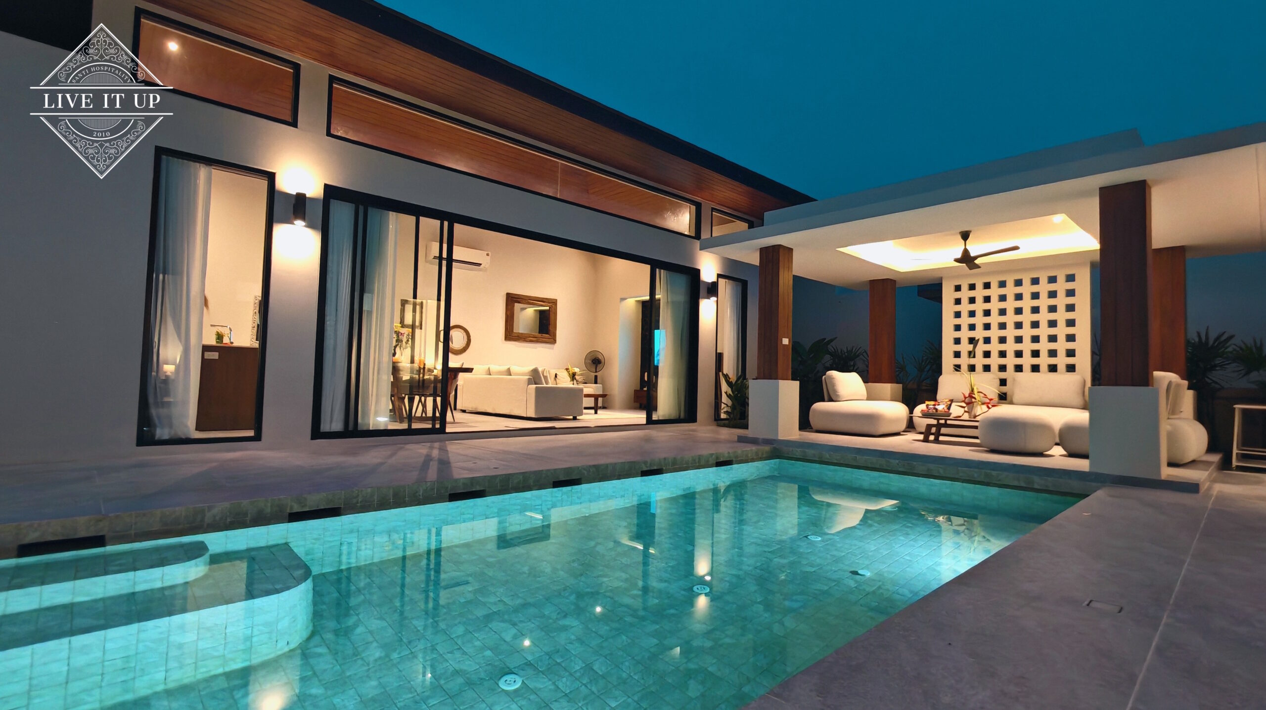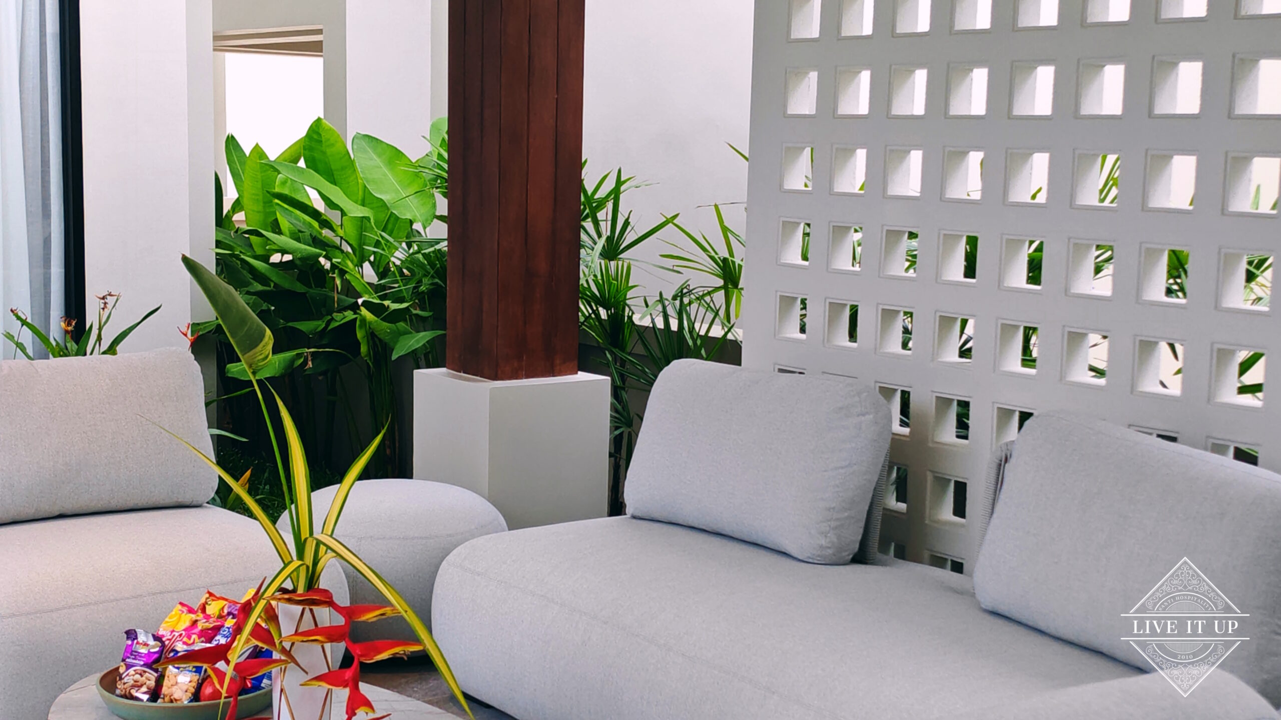 The villa is spread over a series of stunning single-storey pavilions. The leading pavilion houses a spacious open-plan living and dining area, a comfortable lounge and a Western-style fully equipped kitchen with a breakfast island, serving a 6-seater dining table. A guest wash closet and a hidden laundry area are also at the property’s backside. The main bedroom features a large en-suite bathroom and a bathtub. A relaxing outdoor covered Sala seating area sits at the poolside. The centrepiece of the outdoor space is a huge private swimming pool with lush landscaping and natural rock features incorporated into the design. All bedrooms are equipped with smart TVs, huge wardrobes and en suite bathrooms.