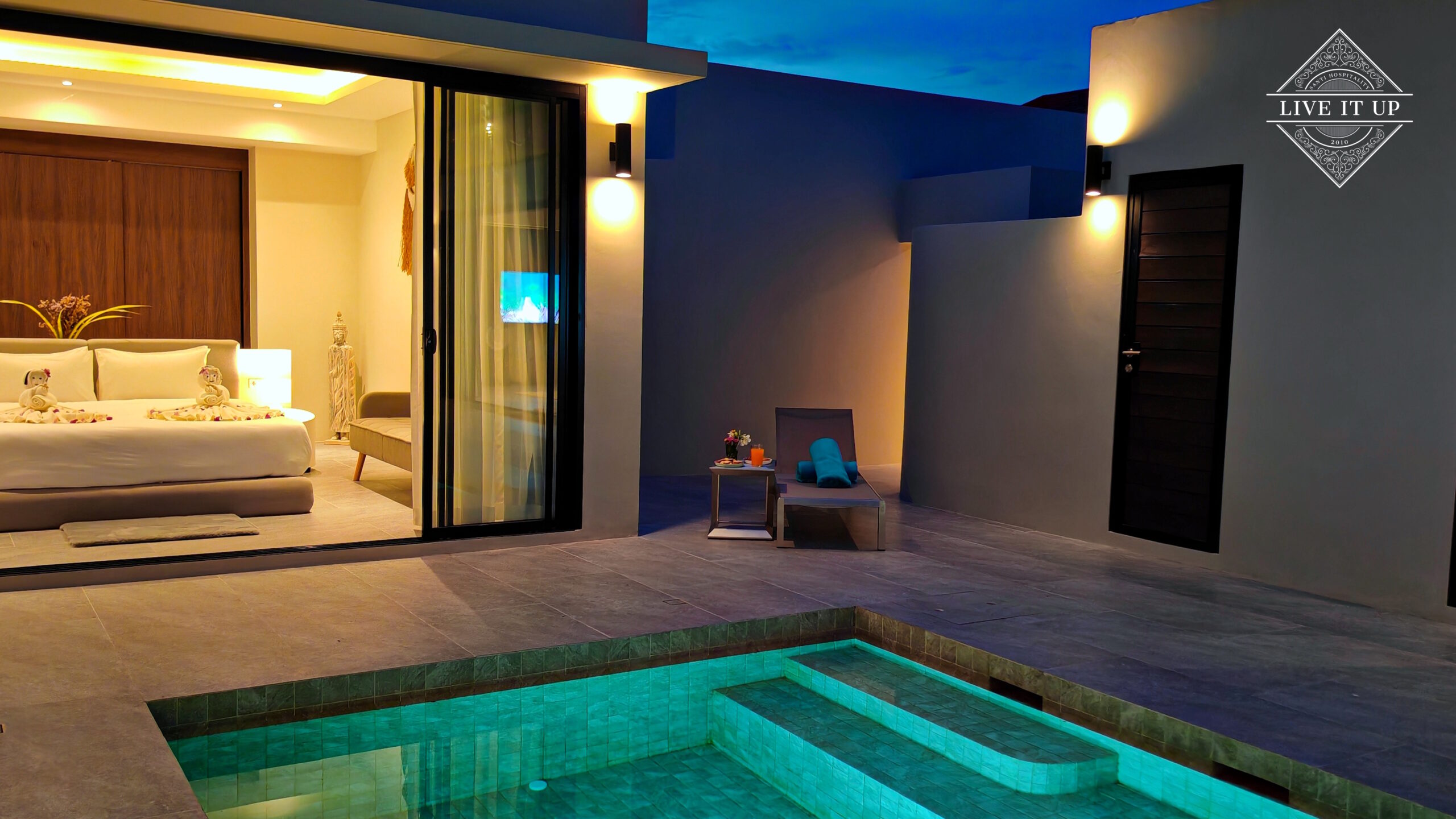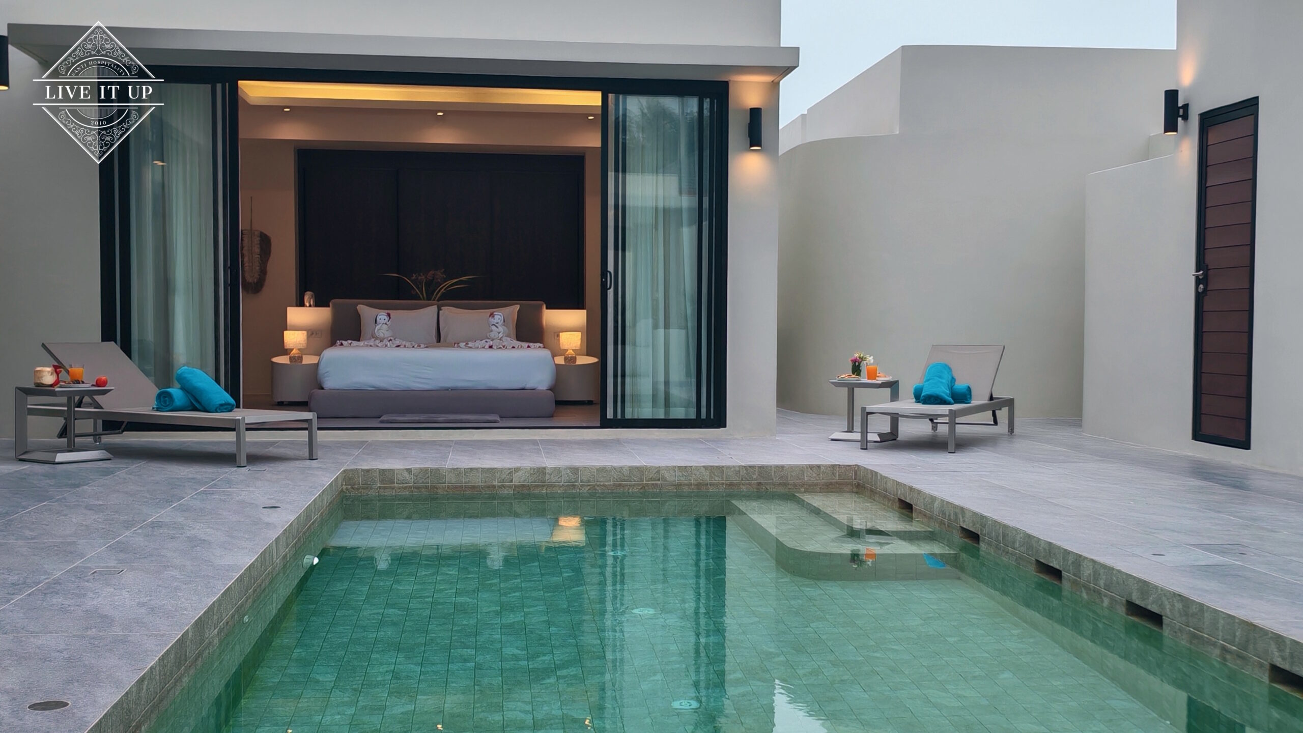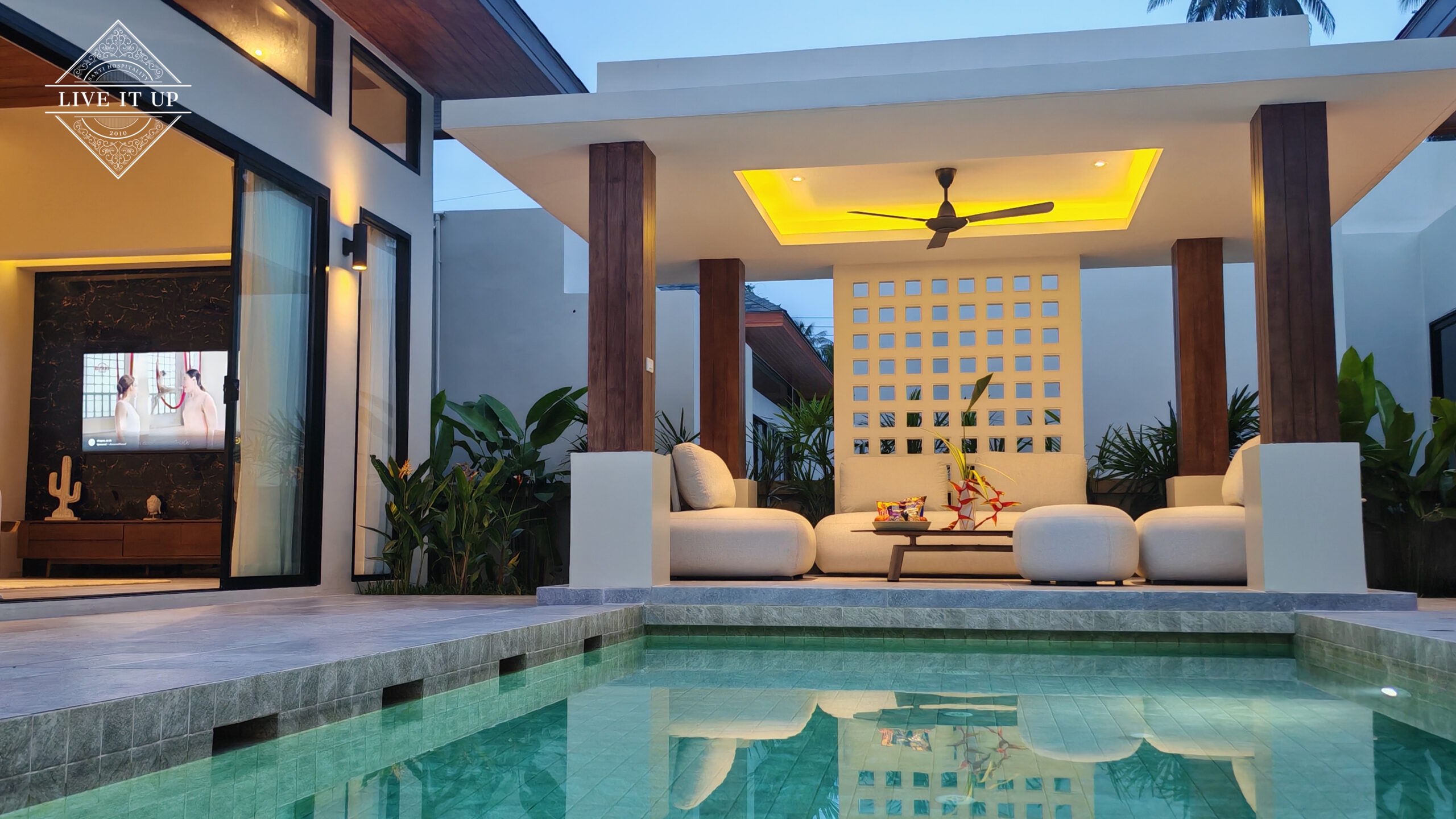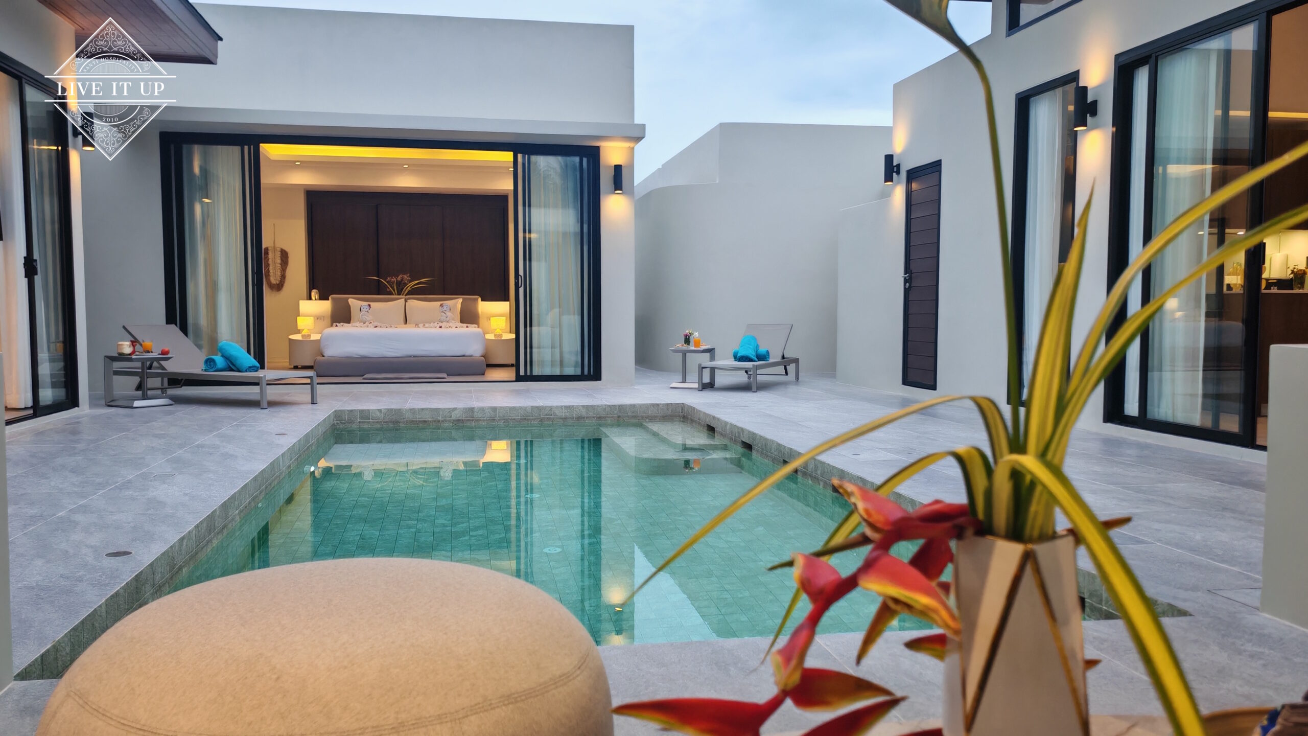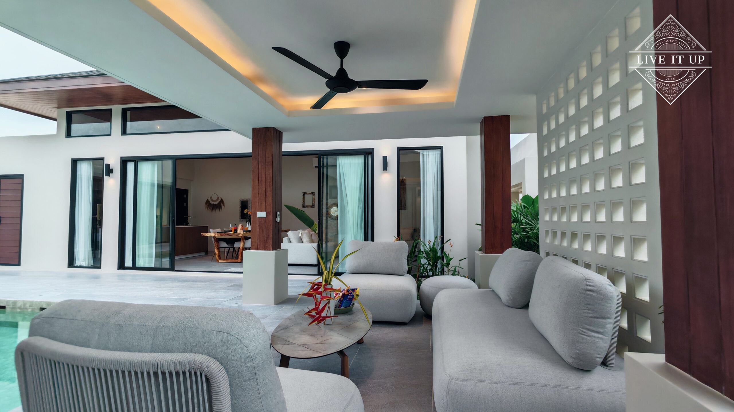 The villa is spread over a series of stunning single-storey pavilions. The leading pavilion houses a spacious open-plan living and dining area, a comfortable lounge and a Western-style fully equipped kitchen with a breakfast island, serving a 6-seater dining table. A guest wash closet and a hidden laundry area are also at the property’s backside. The main bedroom features a large en-suite bathroom and a bathtub. A relaxing outdoor covered Sala seating area sits at the poolside. The centrepiece of the outdoor space is a huge private swimming pool with lush landscaping and natural rock features incorporated into the design. All bedrooms are equipped with smart TVs, huge wardrobes and en suite bathrooms.