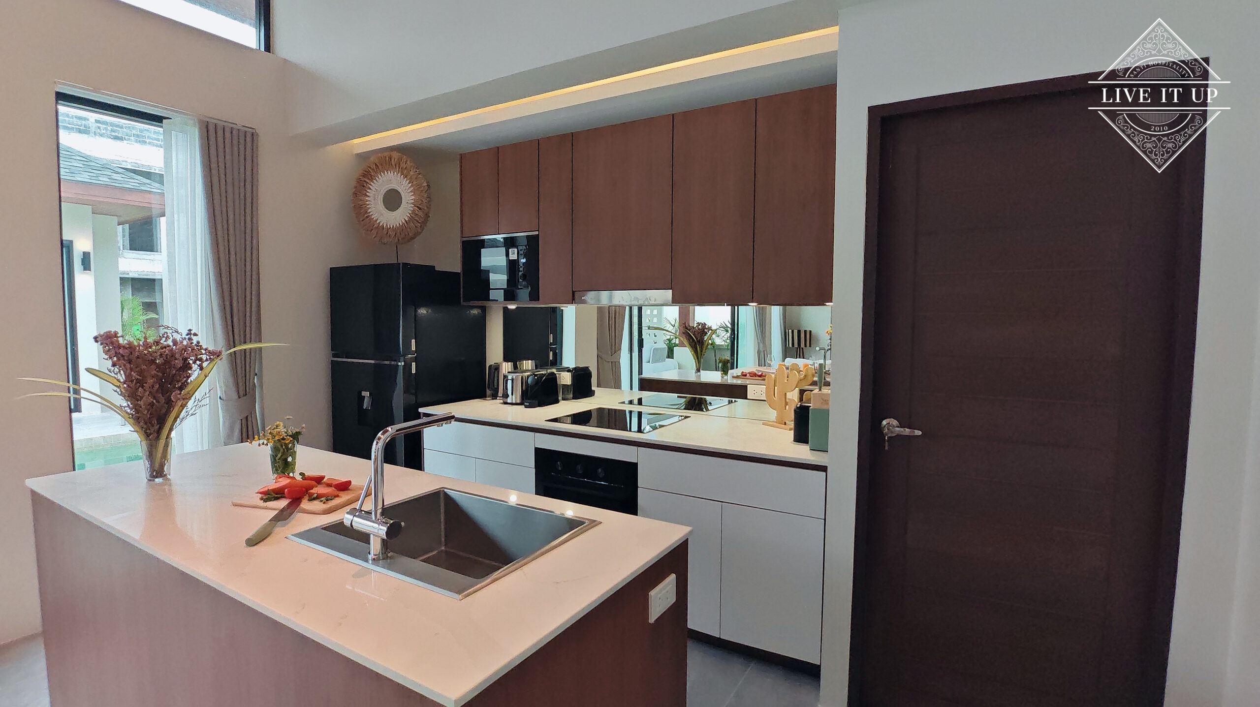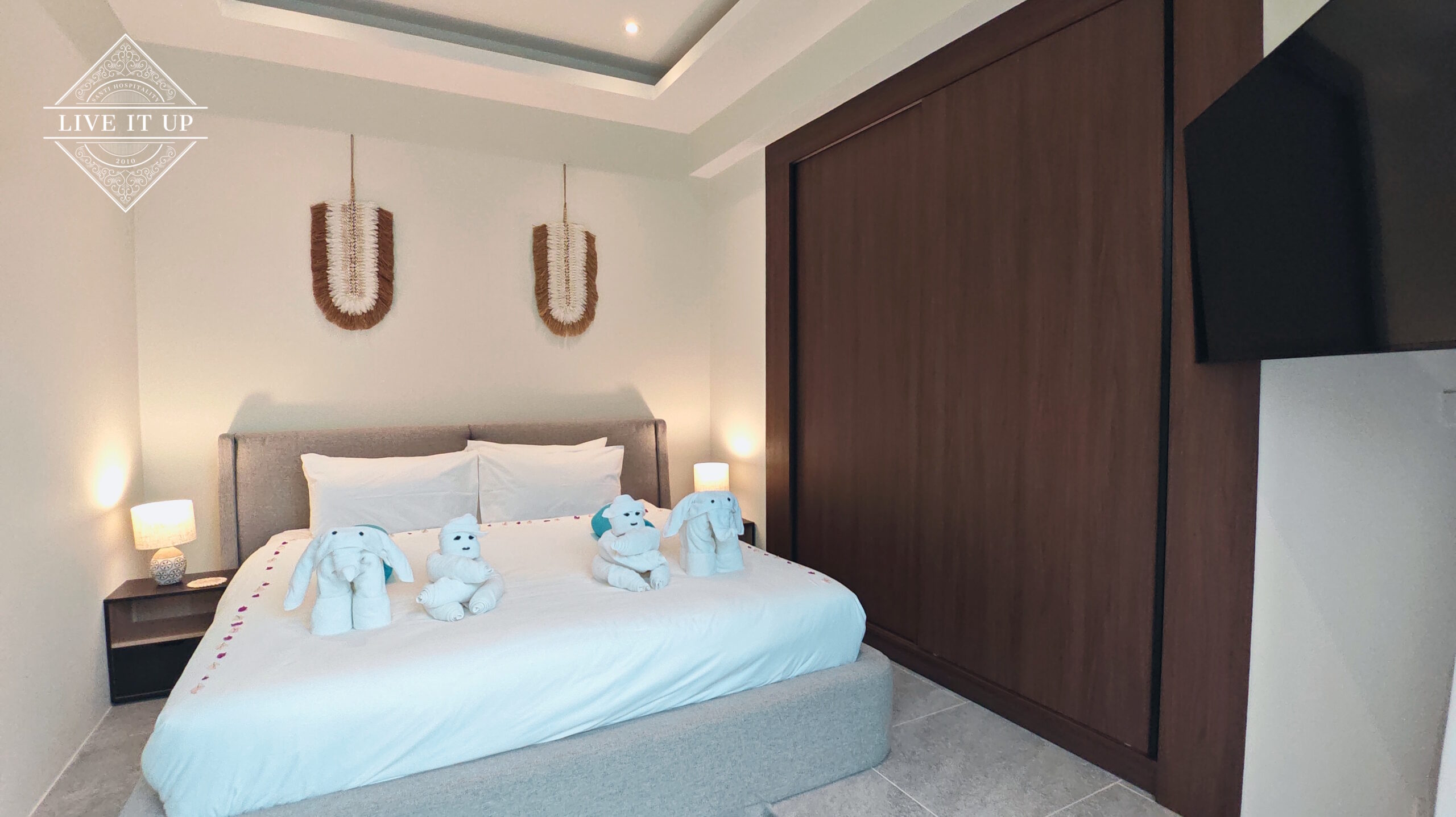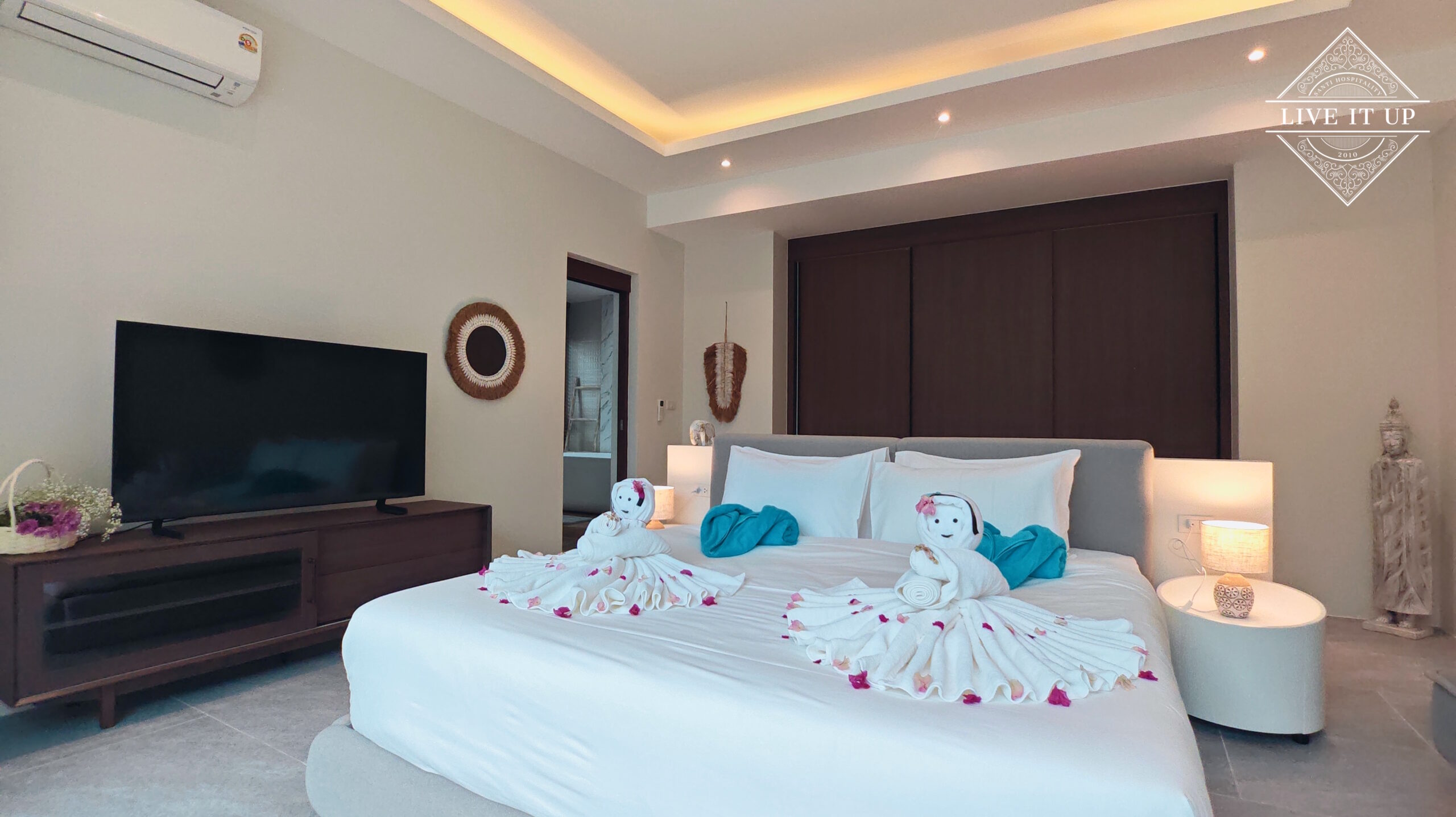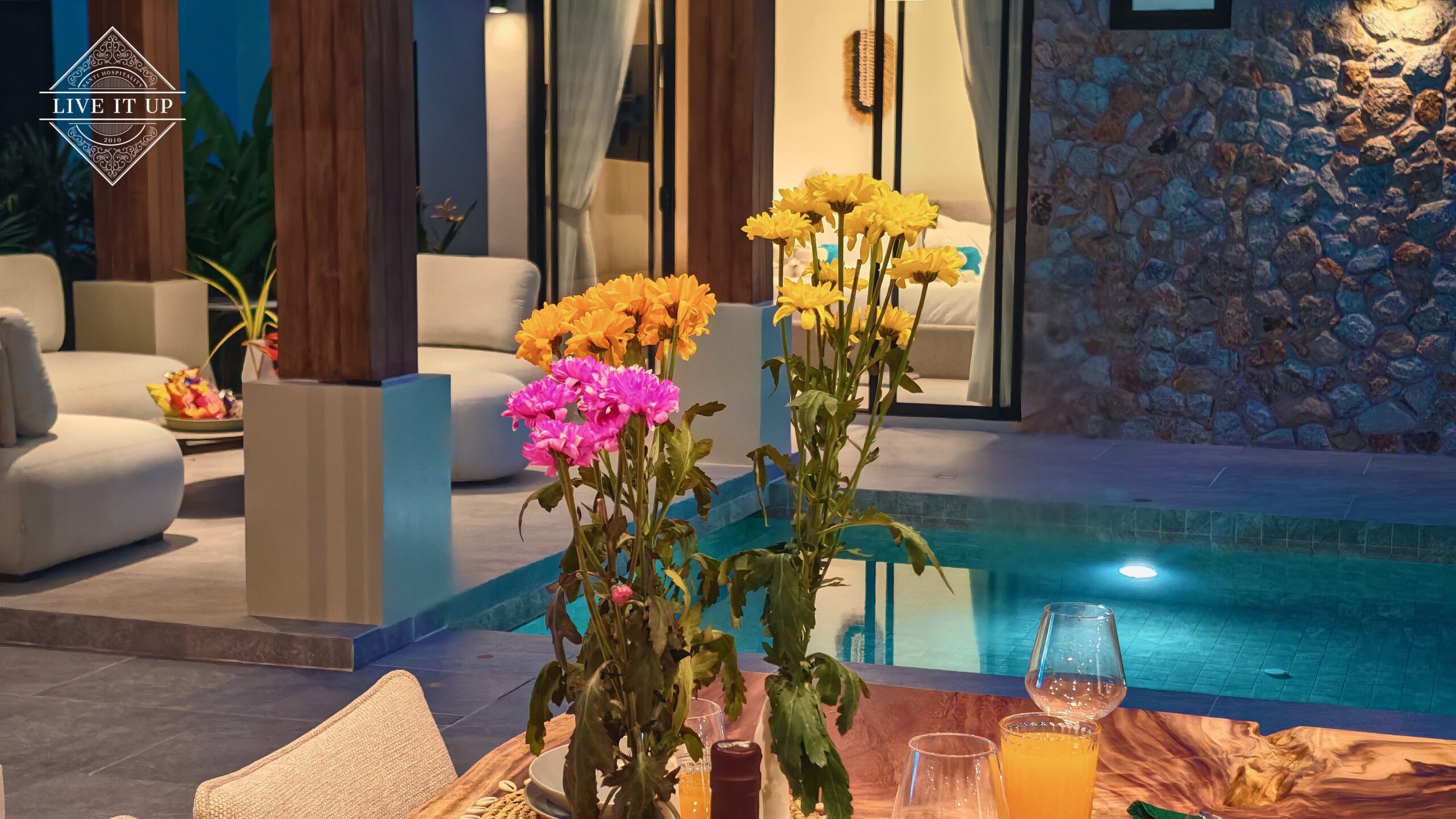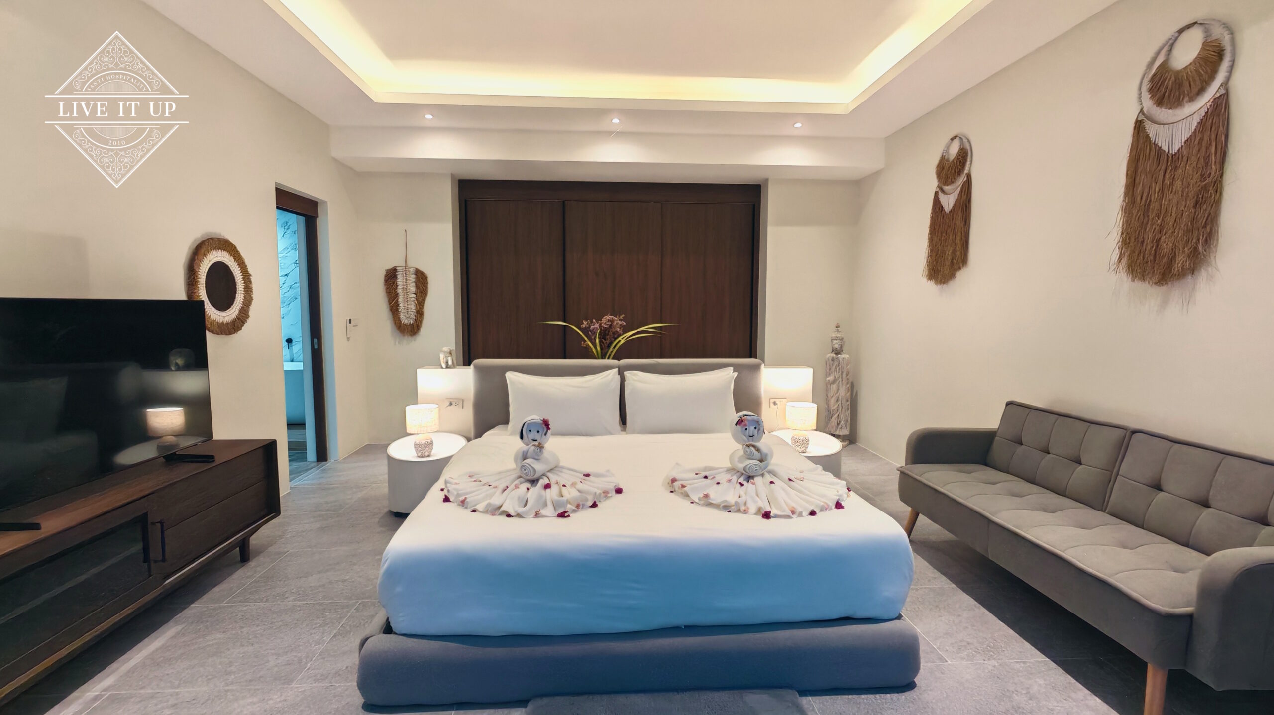The villa is spread over a series of stunning single-storey pavilions. The leading pavilion houses a spacious open-plan living and dining area, a comfortable lounge and a Western-style fully equipped kitchen with a breakfast island, serving a 6-seater dining table. A guest wash closet and a hidden laundry area are also at the property’s backside. The main bedroom features a large en-suite bathroom and a bathtub. A relaxing outdoor covered Sala seating area sits at the poolside. The centrepiece of the outdoor space is a huge private swimming pool with lush landscaping and natural rock features incorporated into the design. All bedrooms are equipped with smart TVs, huge wardrobes and en suite bathrooms.