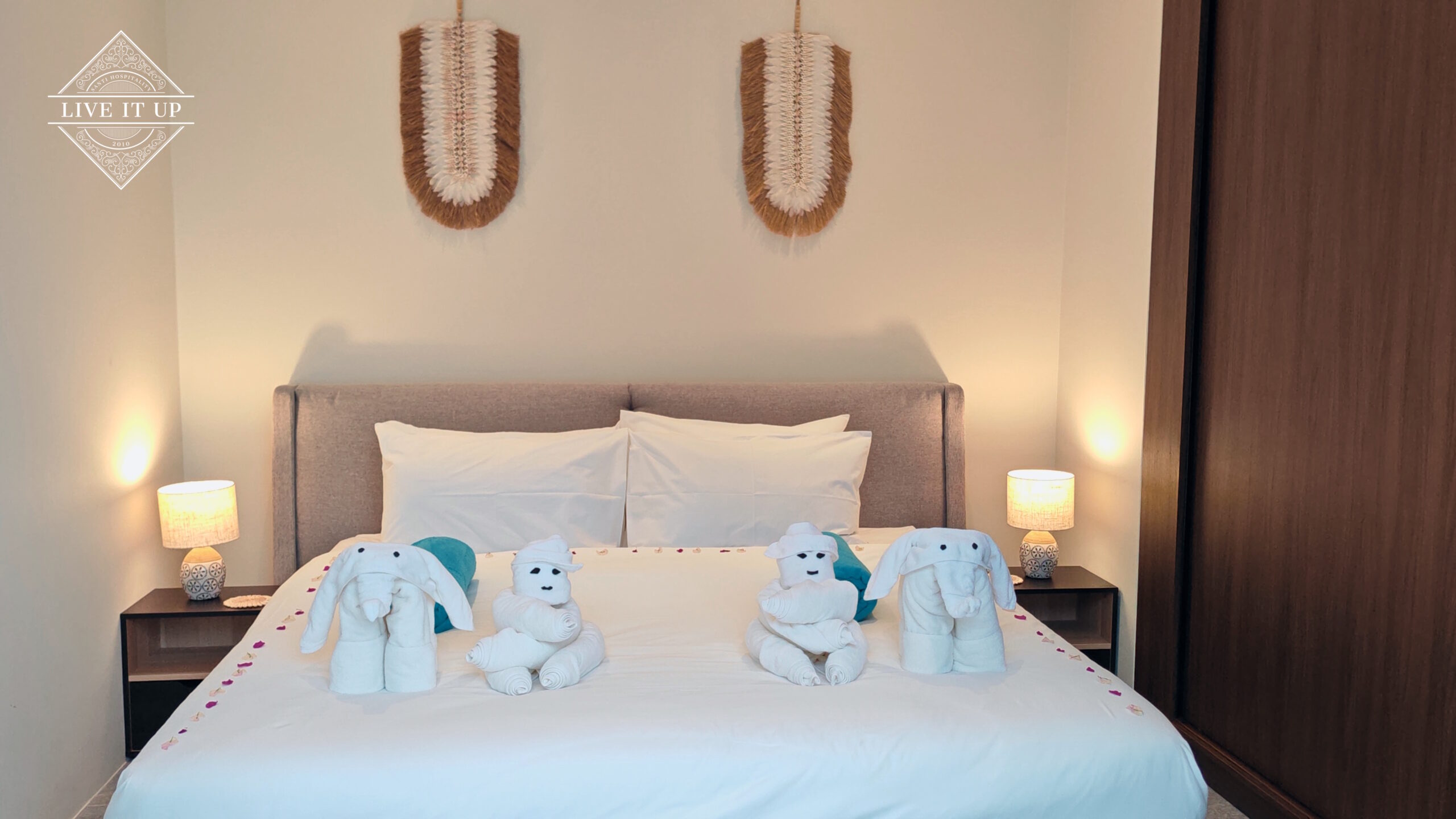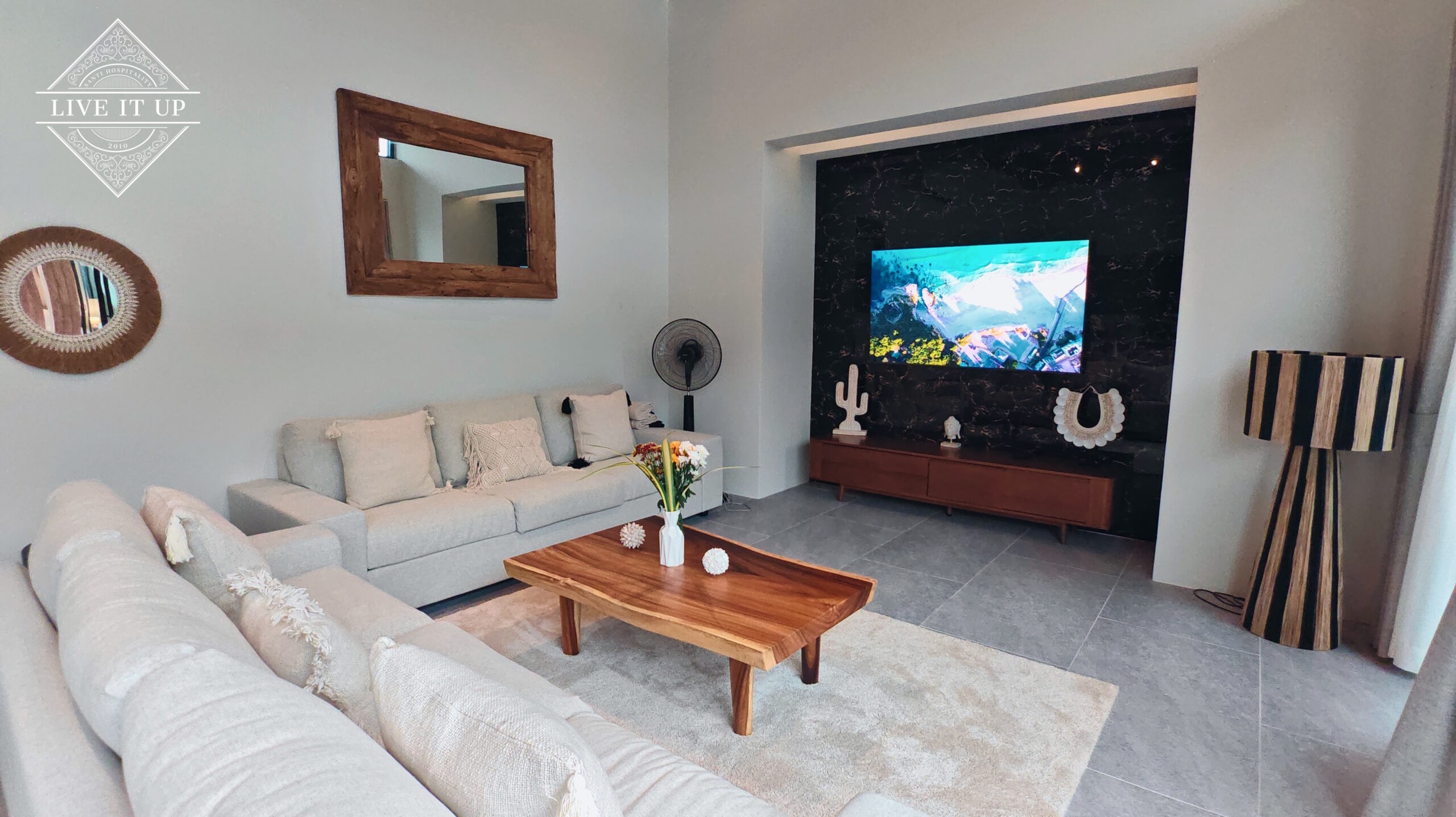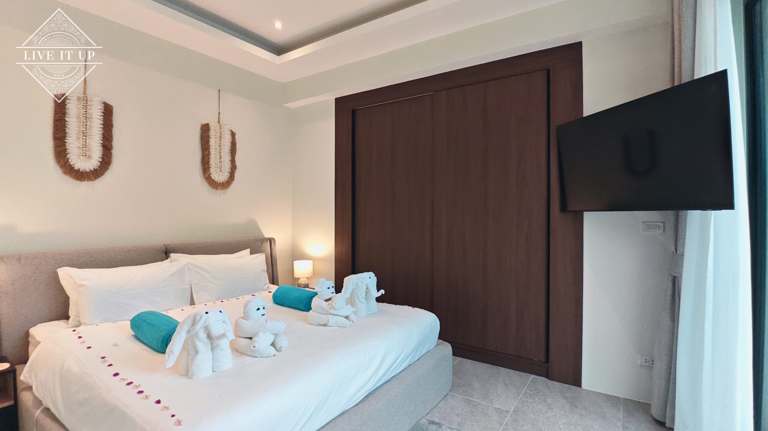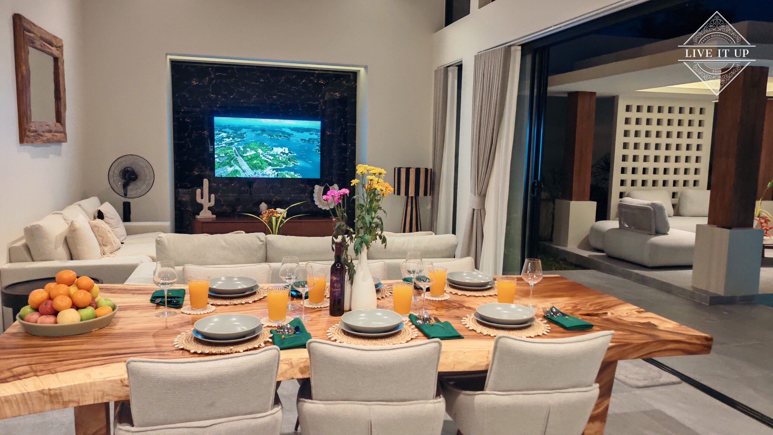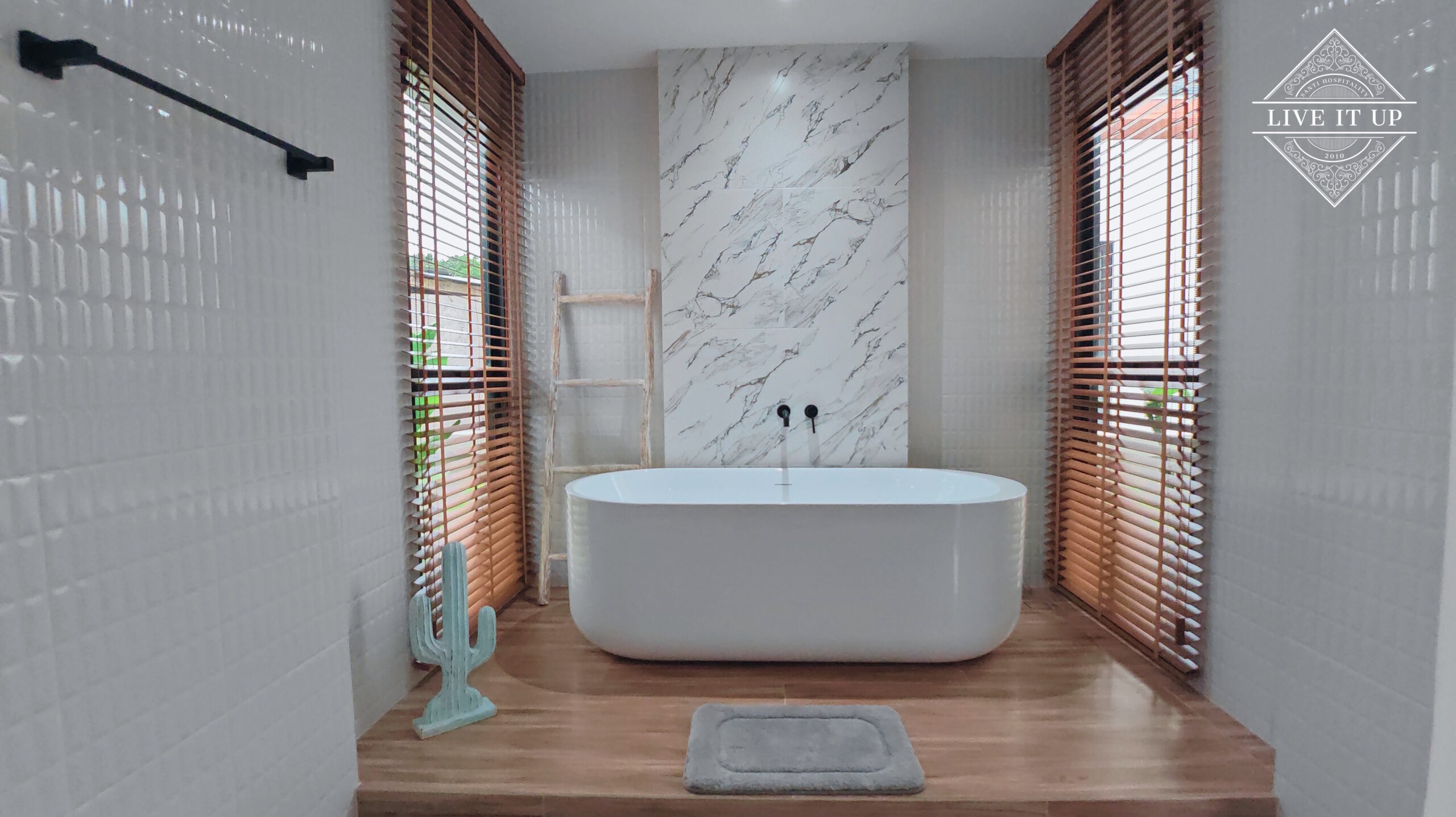 The villa is spread over a series of stunning single-storey pavilions. The leading pavilion houses a spacious open-plan living and dining area, a comfortable lounge and a Western-style fully equipped kitchen with a breakfast island, serving a 6-seater dining table. A guest wash closet and a hidden laundry area are also at the property’s backside. The main bedroom features a large en-suite bathroom and a bathtub. A relaxing outdoor covered Sala seating area sits at the poolside. The centrepiece of the outdoor space is a huge private swimming pool with lush landscaping and natural rock features incorporated into the design. All bedrooms are equipped with smart TVs, huge wardrobes and en suite bathrooms.