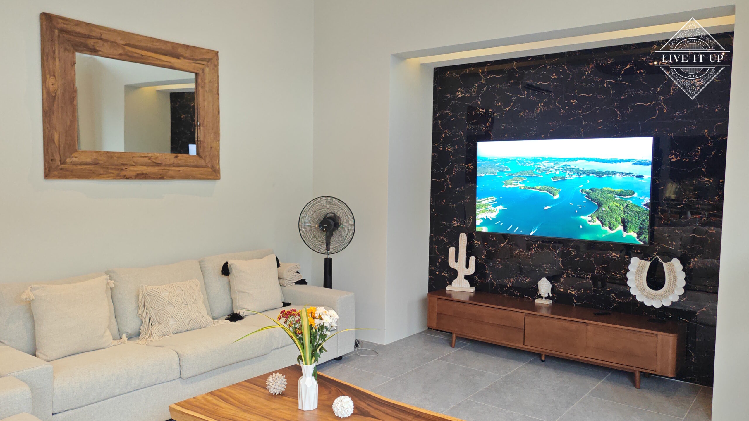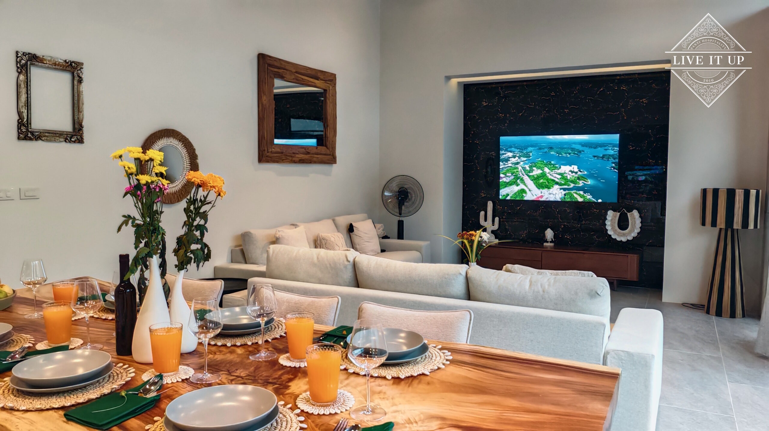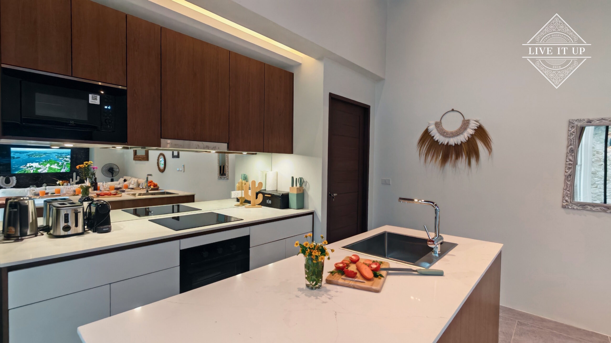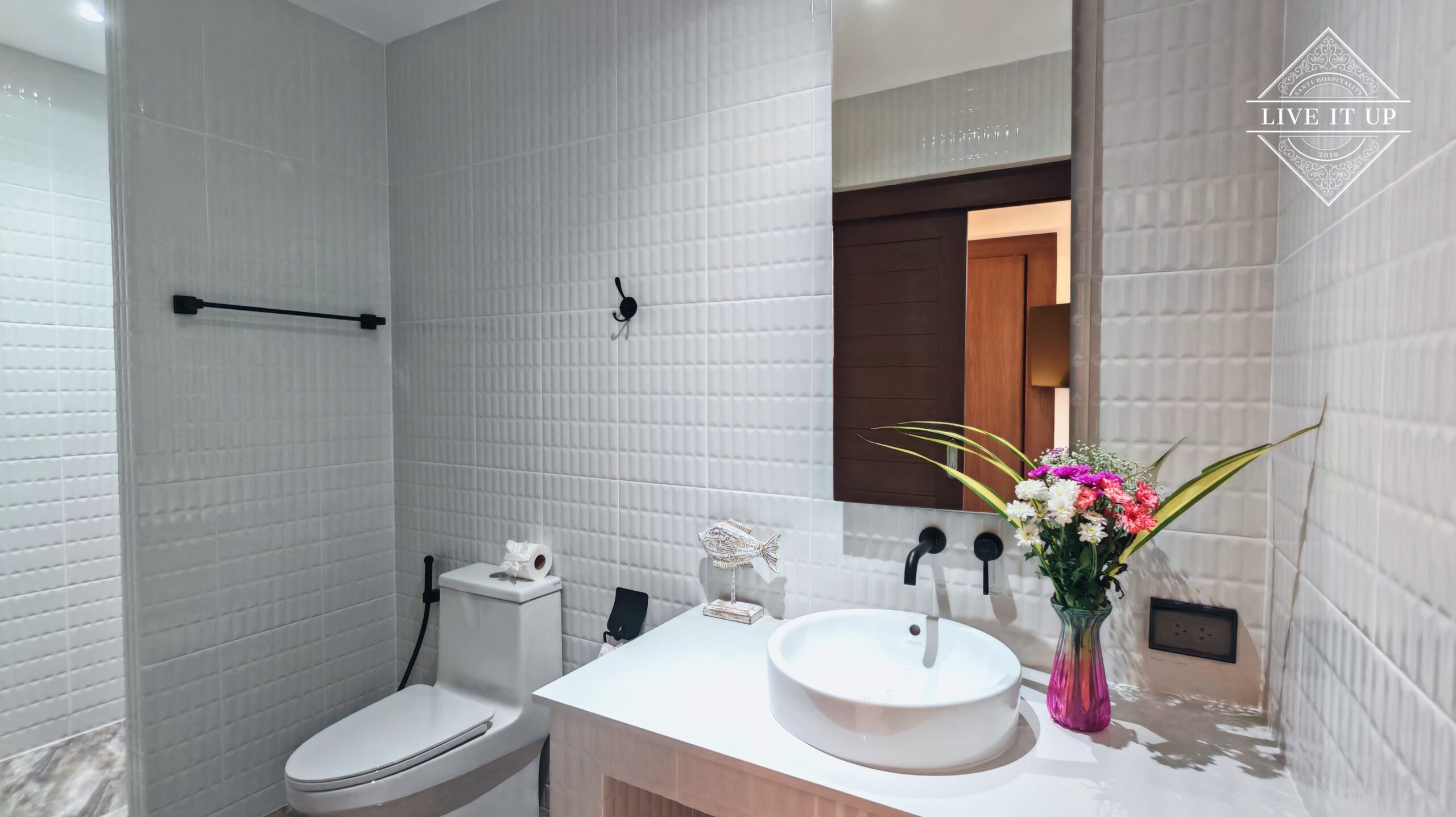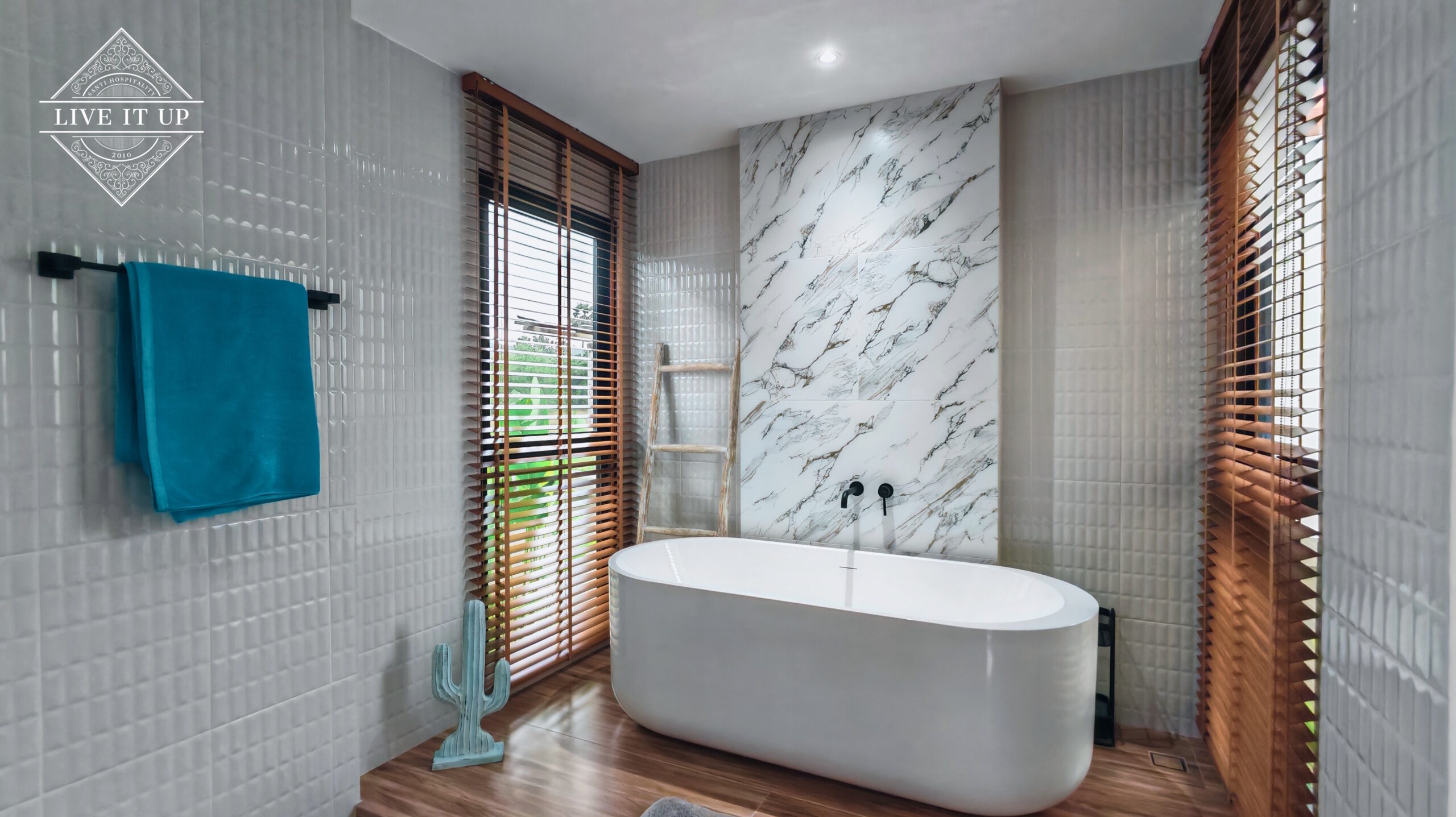 The villa is spread over a series of stunning single-storey pavilions. The leading pavilion houses a spacious open-plan living and dining area, a comfortable lounge and a Western-style fully equipped kitchen with a breakfast island, serving a 6-seater dining table. A guest wash closet and a hidden laundry area are also at the property’s backside. The main bedroom features a large en-suite bathroom and a bathtub. A relaxing outdoor covered Sala seating area sits at the poolside. The centrepiece of the outdoor space is a huge private swimming pool with lush landscaping and natural rock features incorporated into the design. All bedrooms are equipped with smart TVs, huge wardrobes and en suite bathrooms.